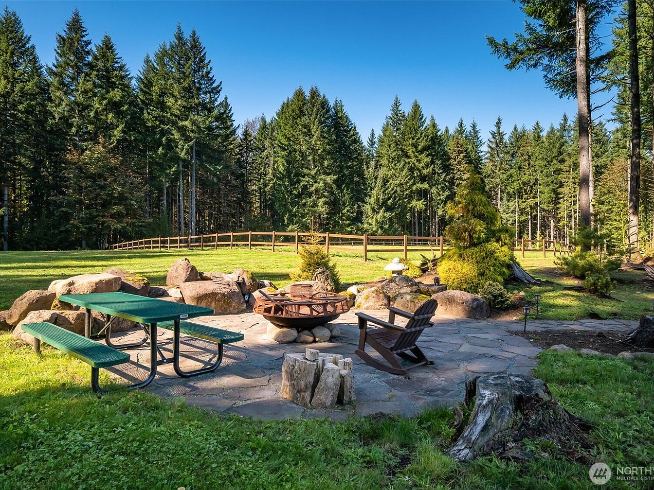 This inviting outdoor space features a circular stone-paved patio hosting a central fire pit surrounded by natural boulders, creating a cozy gathering spot. A classic dark green metal picnic table with attached benches offers casual seating, complemented by a comfortable wooden Adirondack chair nearby for relaxation. The setting is framed by expansive lush green grass and tall evergreen trees, fostering a serene, woodsy ambiance. A rustic wooden fence borders the backdrop, enhancing the rural, peaceful vibe. Natural tree stumps scattered around add a charming, organic touch to this thoughtfully designed outdoor living retreat.