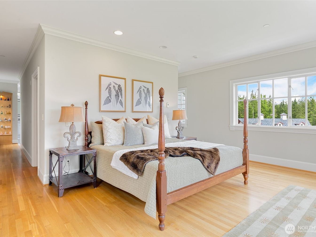 This master bedroom offers a bright and inviting atmosphere with its large window allowing natural light to fill the space and providing a serene view of lush greenery outside. The room features honey-toned hardwood flooring that contrasts warmly with the pale neutral walls and white trim, giving it an airy feel. The four-poster bed made of rich wood is adorned with an assortment of soft, neutral-hued pillows and a textured beige bedspread, complemented by a dark fur throw for added luxury. Matching wooden nightstands with decorative lamps flank the bed, and delicate framed botanical prints add a subtle artistic touch above. Crown molding and recessed lighting complete the room’s elegant yet cozy design.