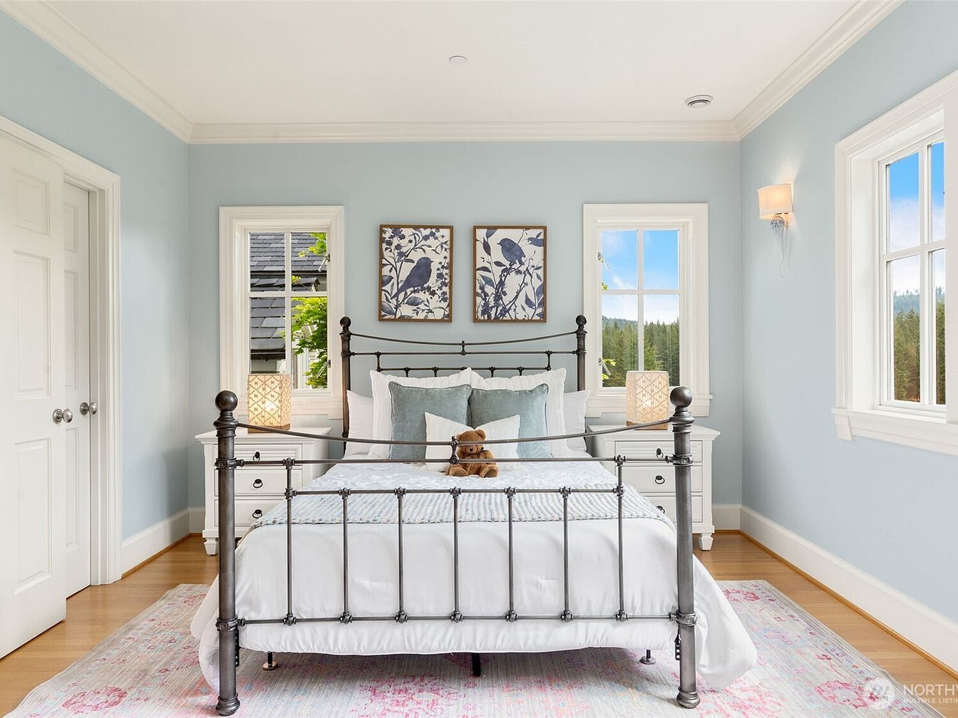 This serene bedroom features soft light blue walls paired with crisp white trim and ceiling, creating an airy and tranquil atmosphere. The iron bed frame with decorative detailing stands as a focal point, dressed in white bedding accented with pale blue pillows and a small brown teddy bear for a touch of charm. Two white nightstands flank the bed, each topped with a sculptural lamp that adds warmth and texture. Natural light pours in through three windows, offering views of lush greenery outside. Subtle wall sconces enhance the room’s peaceful and inviting ambiance, complemented by a delicate pink patterned rug underfoot.