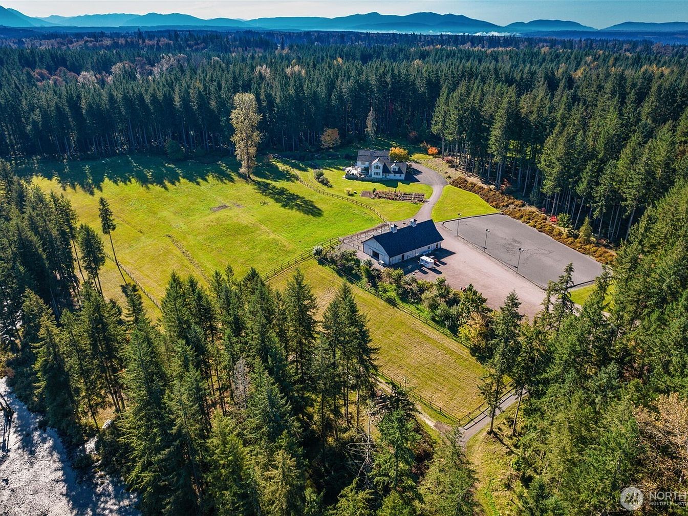 This expansive country estate is nestled within a dense forest, offering privacy and tranquility. The property features a spacious, bright green lawn bordered by a rustic fence that delineates distinct sections of the land. Two main structures sit boldly against the natural backdrop: a charming white farmhouse with dark roofing, and a larger barn-style building with similar roofing, surrounded by a paved area useful for parking or equipment storage. The surrounding towering evergreen trees and distant mountain silhouette create a picturesque setting that blends rural charm with natural beauty, ideal for serene country living.