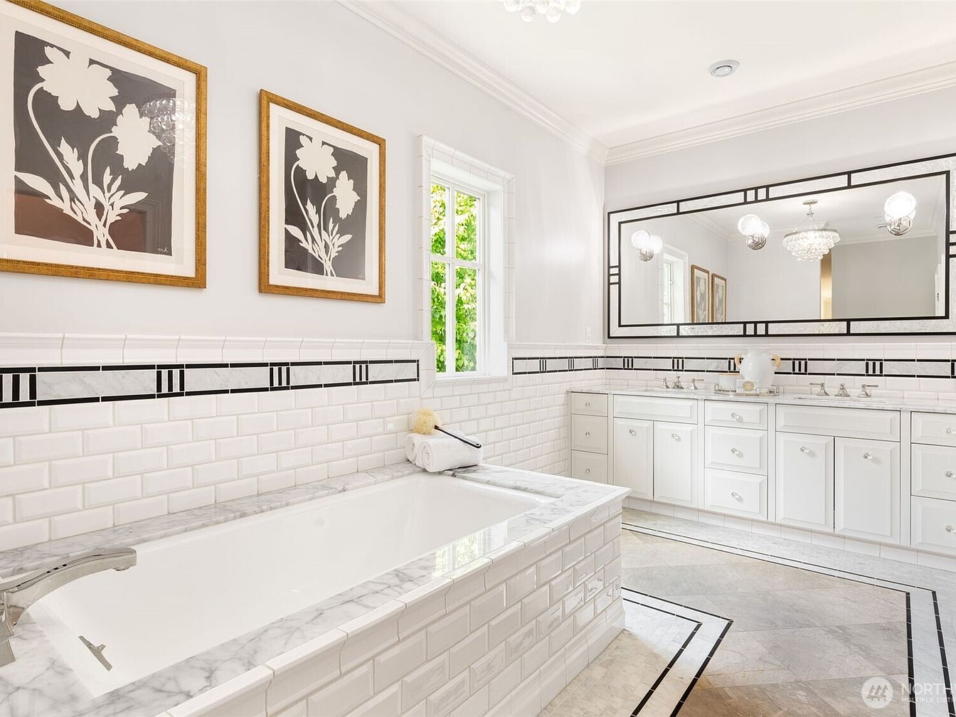 This elegant bathroom features a spacious built-in bathtub with a sleek marble surround and white subway tile finish accented by a black and white geometric border. The large white cabinetry beneath a dual-sink countertop offers ample storage, creating a clean and organized atmosphere. A wide rectangular mirror with a black frame stretches across the vanity wall, enhancing light and space. Soft natural light filters through the window near the bathtub, while two framed floral prints add a subtle artistic touch. The floor’s sophisticated marble tile design incorporates matching black accents for a cohesive and refined aesthetic.