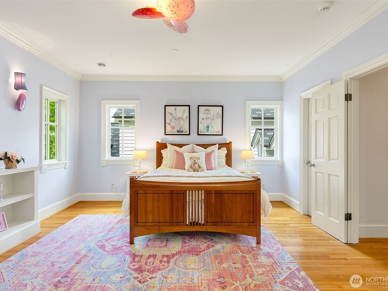This serene bedroom exudes comfort and classic charm, with soft lavender walls complemented by crisp white trim and moldings. A solid wood bed with a warm finish anchors the space, adorned with plush pillows and a small teddy bear that adds a gentle, inviting touch. Twin windows flank the bed, allowing ample natural light to brighten the room, while symmetrical bedside tables hold simple, elegant lamps. The colorful pastel rug, with shades of pink, lavender, and blue, adds a vibrant yet soothing contrast against the light hardwood floor. Built-in shelving and soft wall sconces enhance the cozy, well-rounded ambiance of this restful retreat.