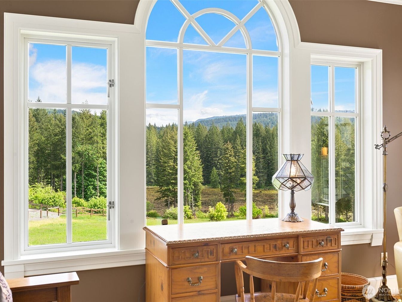 This inviting study nook features a large, striking set of windows, including an elegant arched central window, flooding the space with natural light and showcasing a serene forest view. The contrasting crisp white trim around the windows highlights their unique architectural design against soft taupe walls. The room is anchored by a classic wooden desk with detailed carvings and multiple drawers, paired with a simple wooden chair. A vintage-style lamp with a geometric glass shade adds a warm, artistic touch, while a woven basket subtly peeks underneath, enhancing the cozy, rustic charm.
