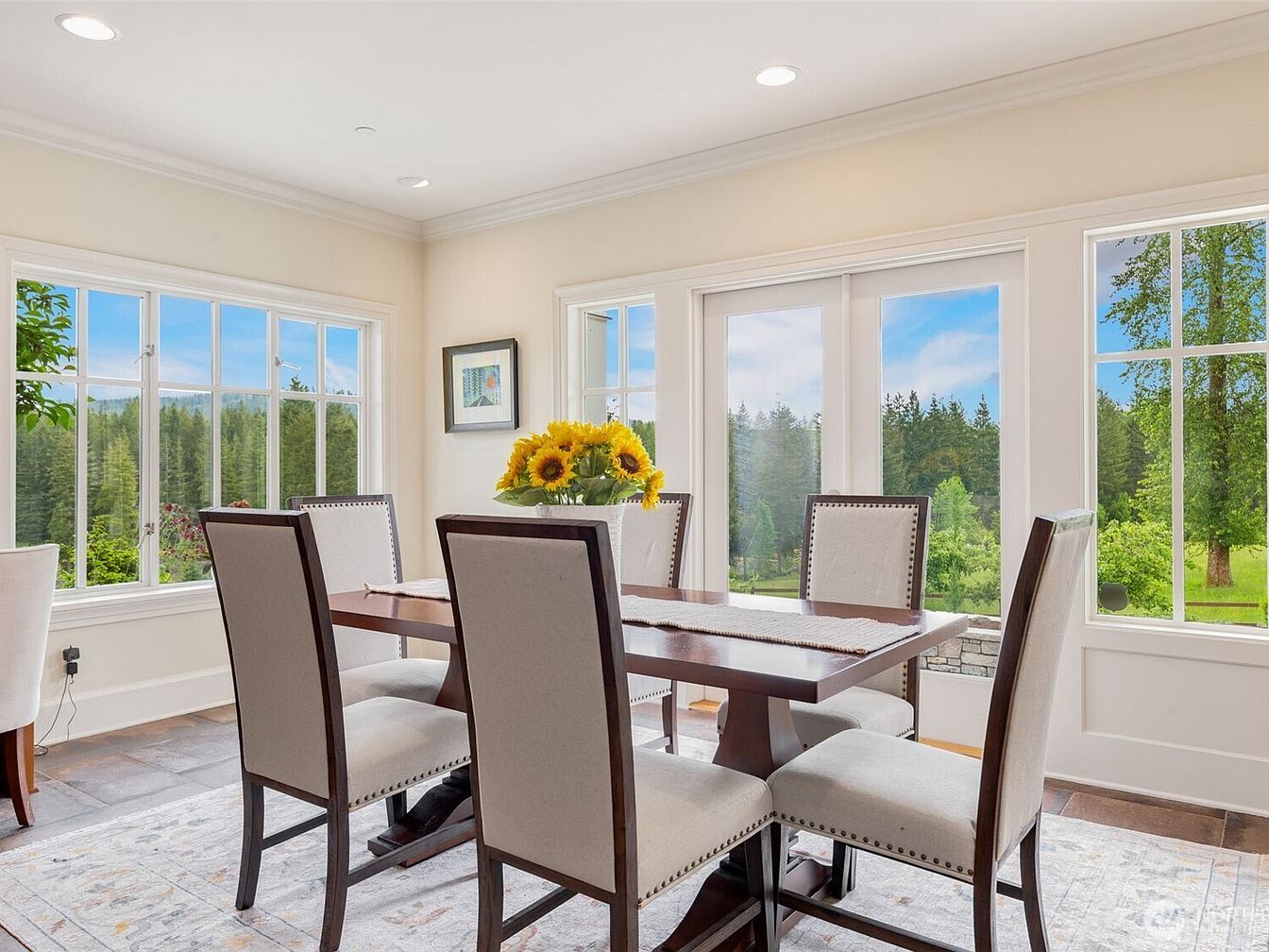 This dining area is bathed in natural light from multiple large windows and glass doors that frame a lush, green garden landscape. The walls and trim are painted a soft, creamy white, creating an airy and inviting atmosphere. A dark wood dining table anchors the space, surrounded by six upholstered chairs in a neutral beige tone with nailhead trim, offering both comfort and elegance. The floor features a warm, earthy tile, complemented by a subtle, patterned area rug underneath the table. A bright bouquet of sunflowers adds a cheerful pop of color, enhancing the fresh, serene vibe of this classic yet contemporary dining space.