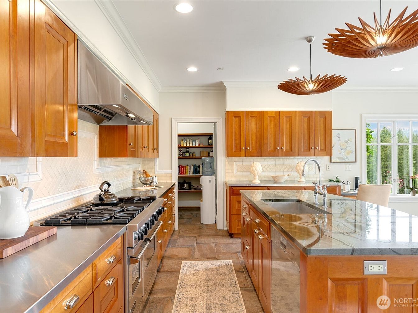 This kitchen features a spacious layout centered around a large island with a polished stone countertop that reflects natural light streaming through a window. Rich wooden cabinetry in a warm honey tone lines the walls and the island, offering abundant storage and a classic look. The stainless steel gas range with multiple burners and a sleek vent hood combines functionality with modern style. Elegant pendant lights hang from the ceiling, designed with wooden elements that complement the cabinetry. A glimpse into a neatly organized pantry adds practical appeal, while the tiled floor and neutral backsplash complete the bright, inviting atmosphere.