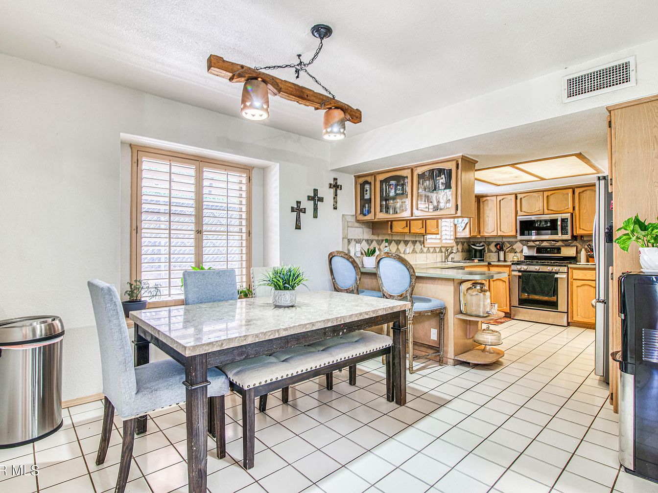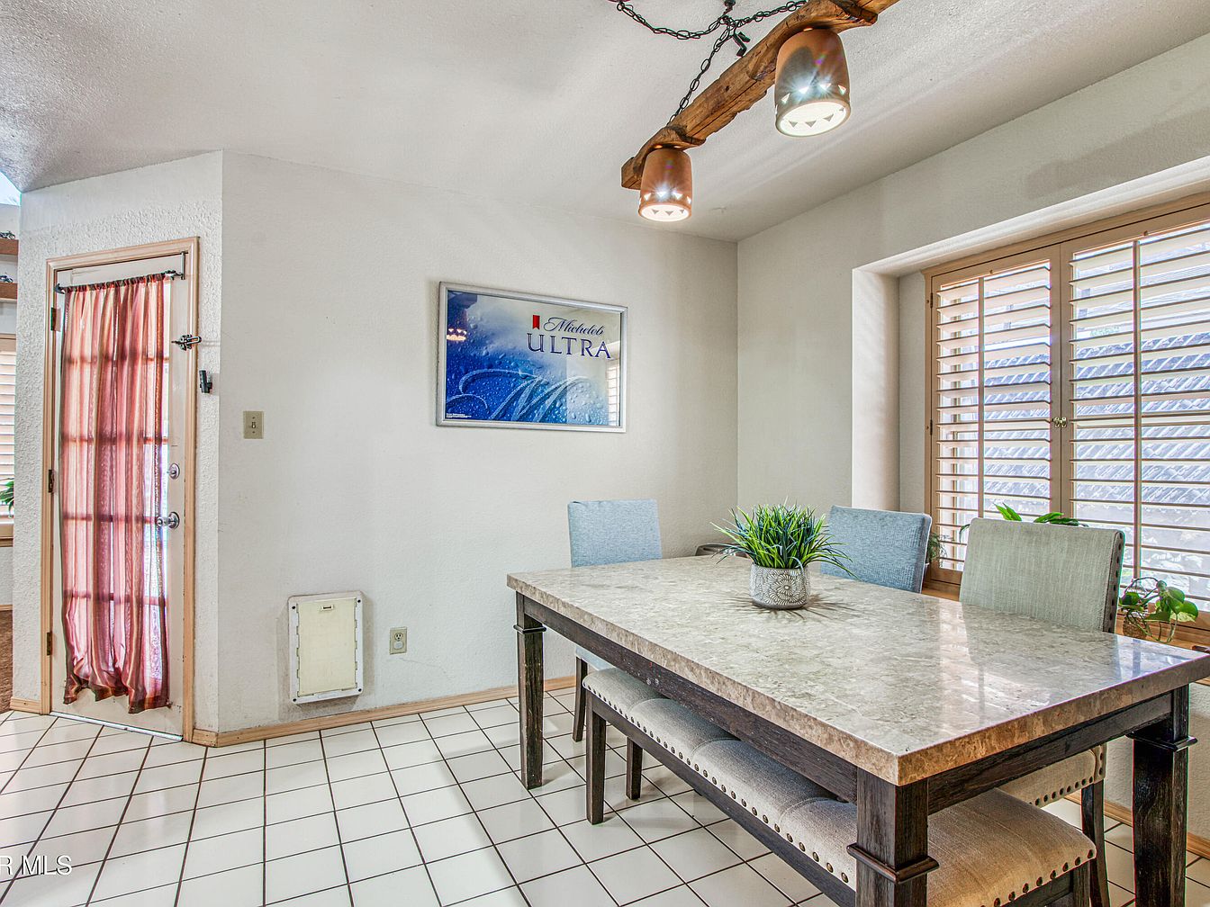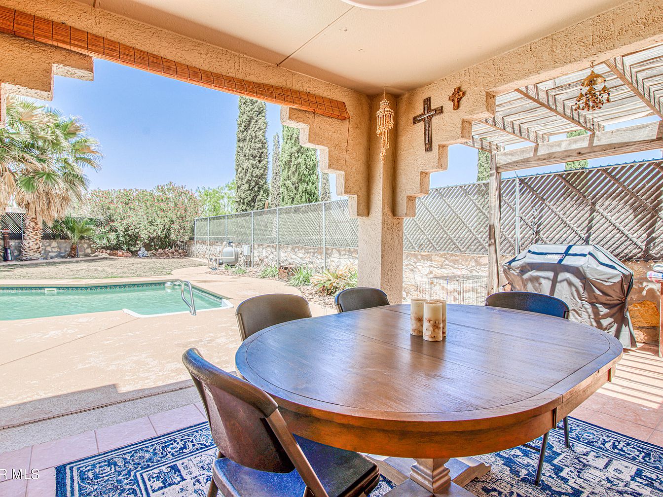 This covered patio space offers a charming outdoor dining experience with a rustic wooden table surrounded by four metal chairs on a patterned blue and white rug. Architectural stucco walls with unique stepped cutouts frame the views of a private pool and garden area, enhancing the southwestern aesthetic. Warm beige tones dominate, complemented by natural wood and wrought iron elements. The ceiling features hanging decorative accents, including a beaded ornament and two cross wall hangings, adding personality to the space. Adjacent to the seating area, a covered grill suggests this area is ideal for casual meals and outdoor gatherings.