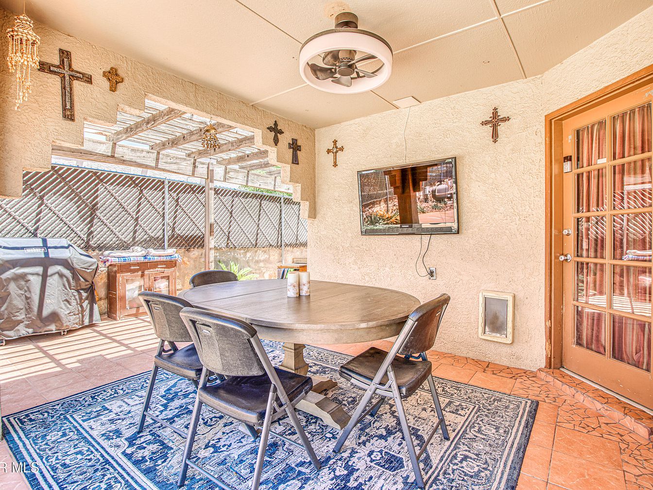 This covered patio features a cozy outdoor dining space with a round wooden table surrounded by four simple black folding chairs. A patterned blue and white area rug adds texture and color to the terracotta tile flooring, creating a defined eating zone. The walls and ceiling have a textured stucco finish in warm beige tones, complemented by several decorative crosses mounted on the walls, lending a personal and rustic touch. A ceiling fan with integrated lighting hangs centrally for airflow and comfort. The area is partially enclosed by a pergola, offering filtered sunlight, and includes a wall-mounted flat-screen TV for entertainment. A French door with glass panes and red curtains connects the patio to the interior, enhancing indoor-outdoor flow.