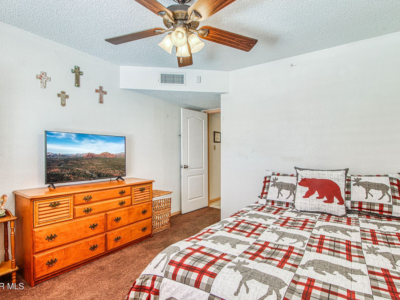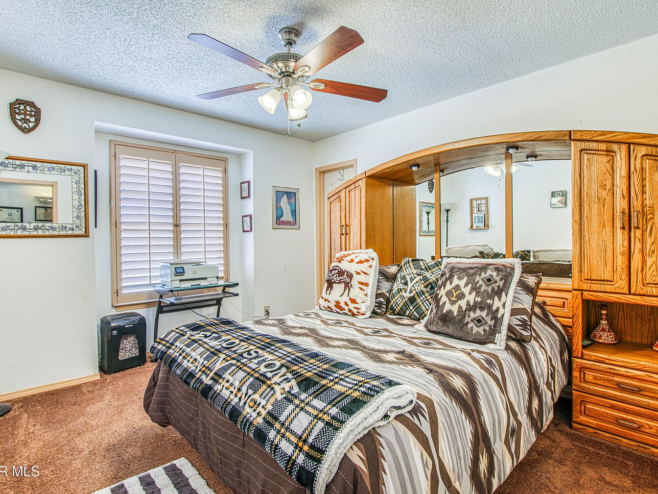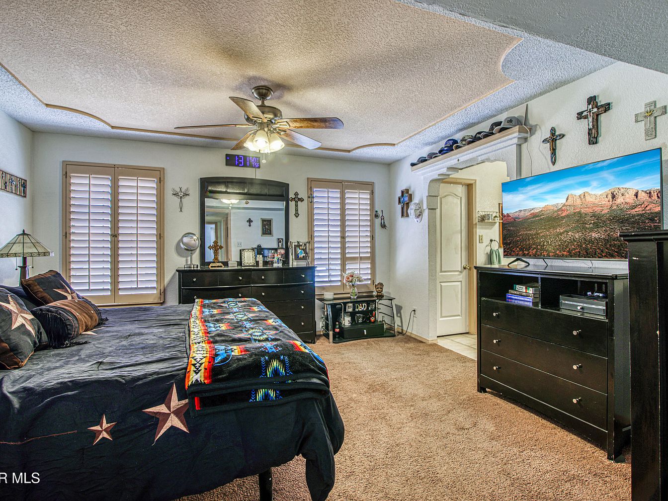 This master bedroom features a cozy and inviting atmosphere with warm beige carpeting anchoring the space. The walls are painted a soft neutral tone, complementing the black furniture pieces including a dresser with matching mirror and a large TV stand. Decorative crosses adorn the walls, adding a personal and spiritual touch. Two windows with plantation shutters allow filtered natural light, enhancing the room’s calm ambiance. The bed is dressed with dark bedding adorned with star patterns and a colorful southwestern-style blanket, echoing a rustic yet modern aesthetic. A ceiling fan with light fixture provides practical illumination and airflow, while small accent pieces, such as hats and framed photos, create a lived-in feel.