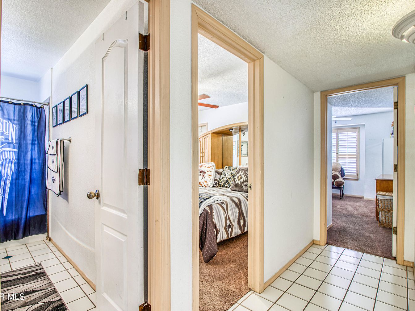 This hallway connects two bedrooms and a bathroom, featuring white tiled flooring with beige grout and walls painted in a clean, bright white. The door frames have a natural light wood finish that contrasts subtly with the white walls. On the left is a bathroom with a navy-blue nautical-themed shower curtain, towel racks with patterned towels, and black-and-white framed pictures above the towel rail. Into the bedrooms, plush brown carpeting softens the space, while the visible bedroom showcases a bed with earth-toned bedding adorned with geometric and animal motifs, creating a cozy, rustic vibe.