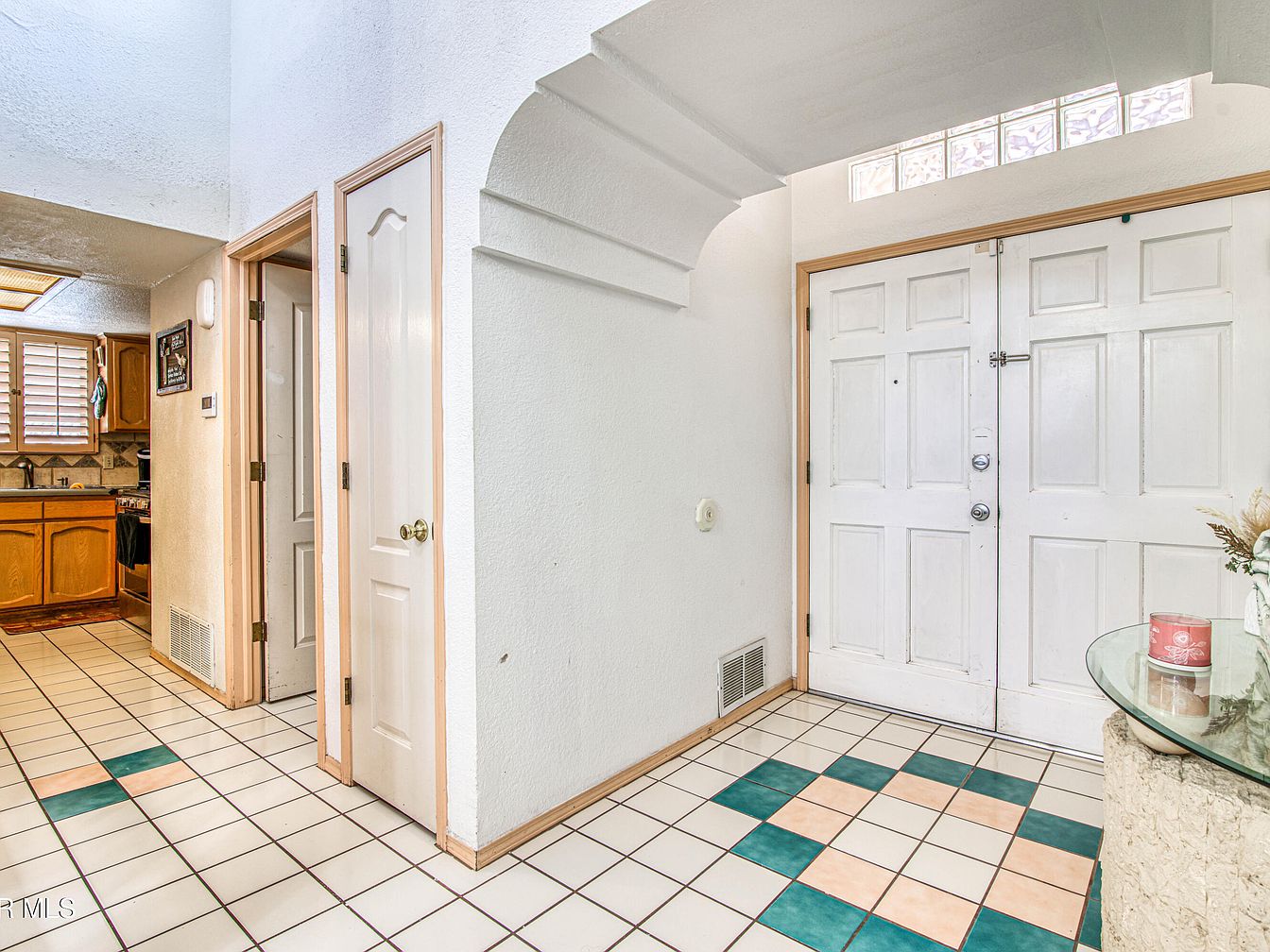 This entryway presents a bright, welcoming space highlighted by large white double doors allowing ample natural light through the glass block transom window above. The floor features a tiled pattern with teal and beige accent tiles forming a centered square design, contrasting the predominantly white floor tiles. Textured white walls are paired with natural wood trim around doors and baseboards, creating a light, airy atmosphere. Visible nearby is a glimpse into a warm, wood-toned kitchen with classic cabinetry and tiled backsplash, contributing warmth and texture to the overall aesthetic. The space conveys a blend of functional layout and subtle decorative details.
