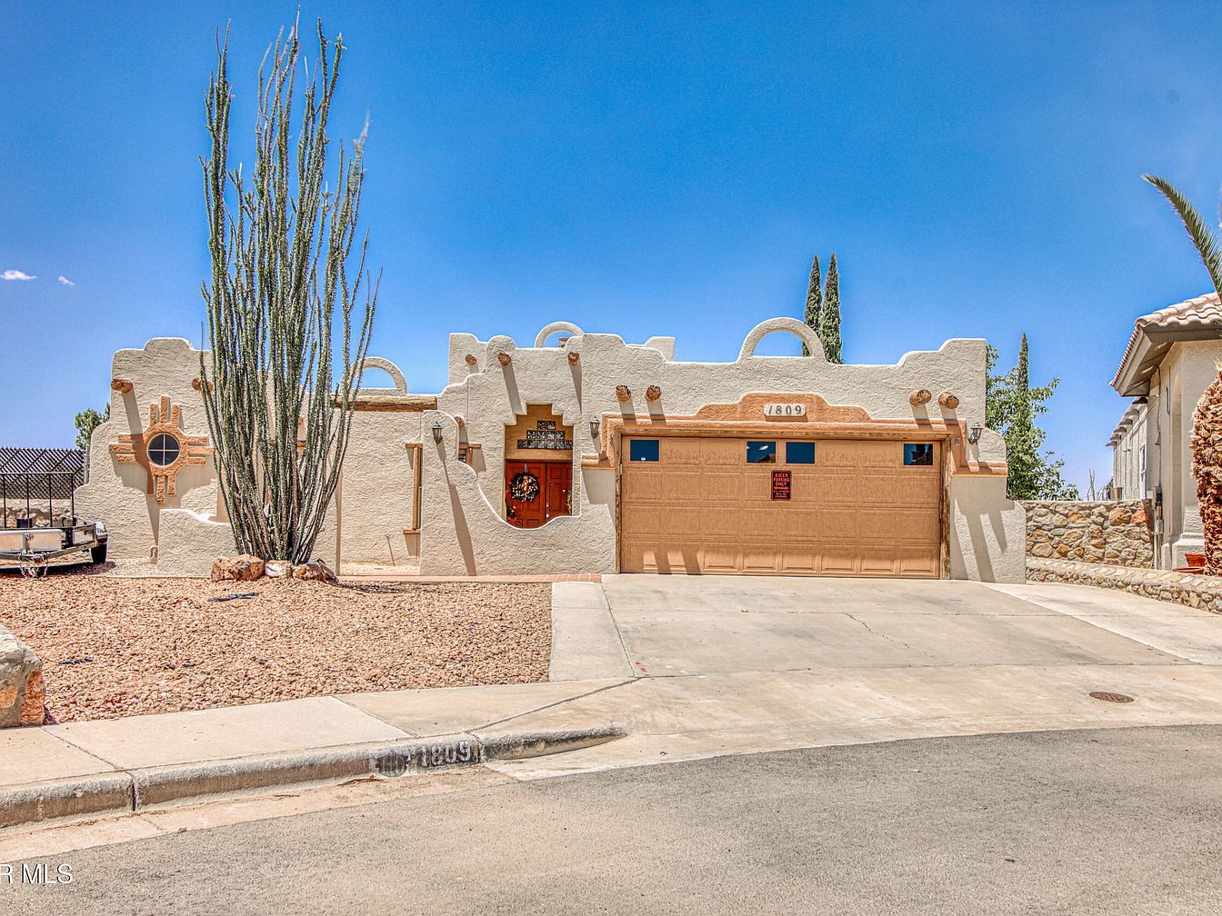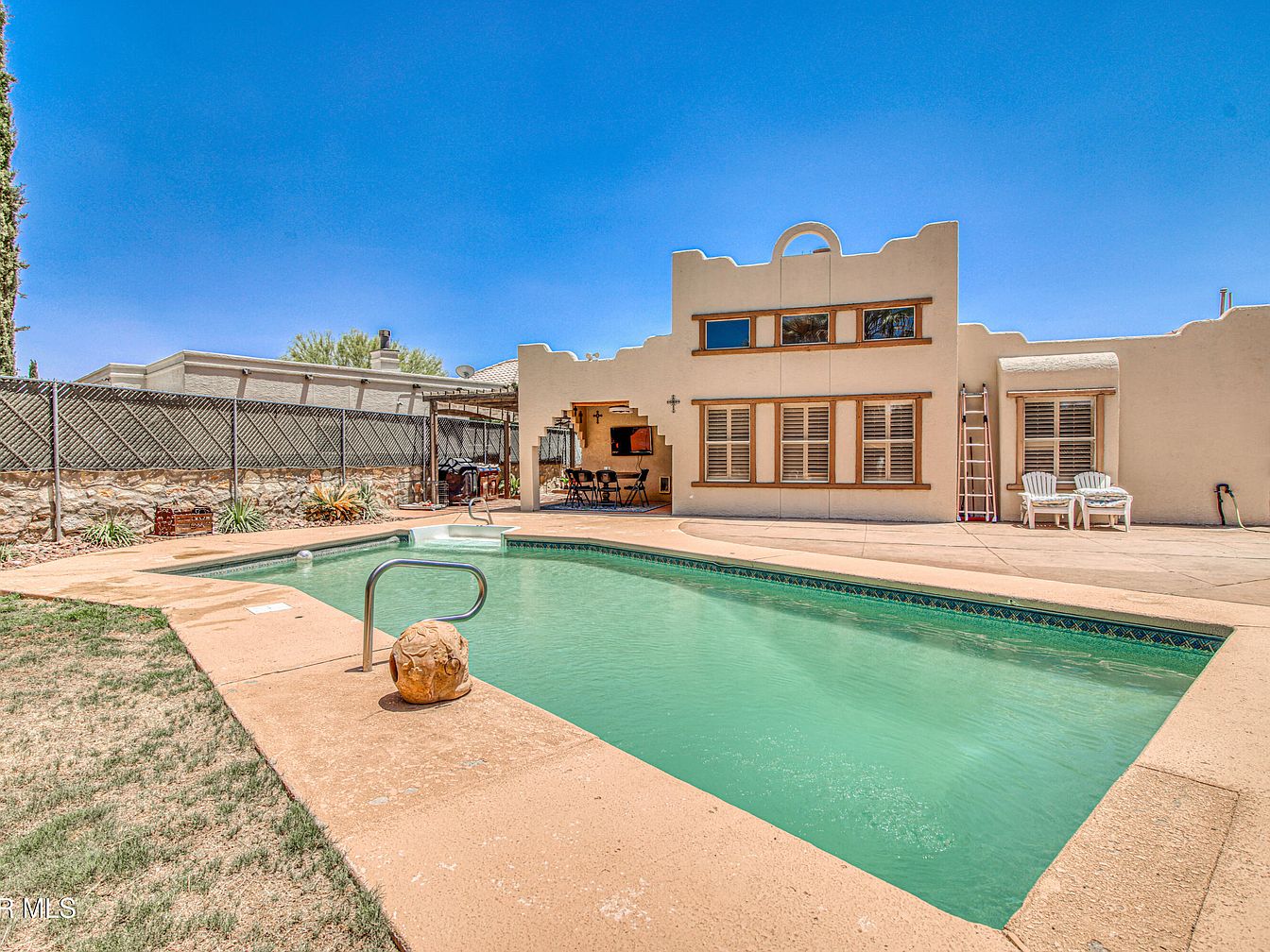 This beautifully designed Southwestern-style home is located in the vibrant city of El Paso, Texas. The single-story residence boasts smooth stucco walls combined with distinctive rounded architectural details and striking wooden beam accents that embody authentic Southwestern charm. The property includes a sparkling swimming pool, ideal for relaxation and entertaining guests. Listed at $279,950, this charming retreat presents an attractive option for those seeking a unique and comfortable living experience in El Paso.