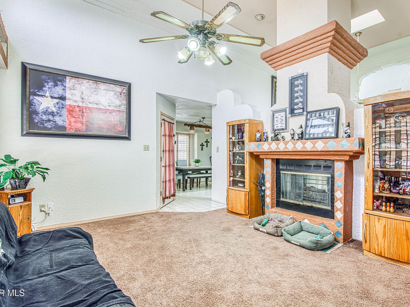 This cozy living room centers around a colorful tiled fireplace with warm terracotta and blue diamond accents, flanked by wooden display cabinets showcasing collectibles. The walls are painted in a textured off-white, contrasted by plush beige carpeting. A Texas flag artwork adds local character above the black-covered sofa on one side. The ceiling is vaulted, featuring a large vintage ceiling fan with multiple light bulbs, enhancing the room’s brightness. An open doorway leads into the adjacent dining area with tile flooring and soft natural light filtering through curtains. Two pet beds add a lived-in, welcoming touch near the hearth.