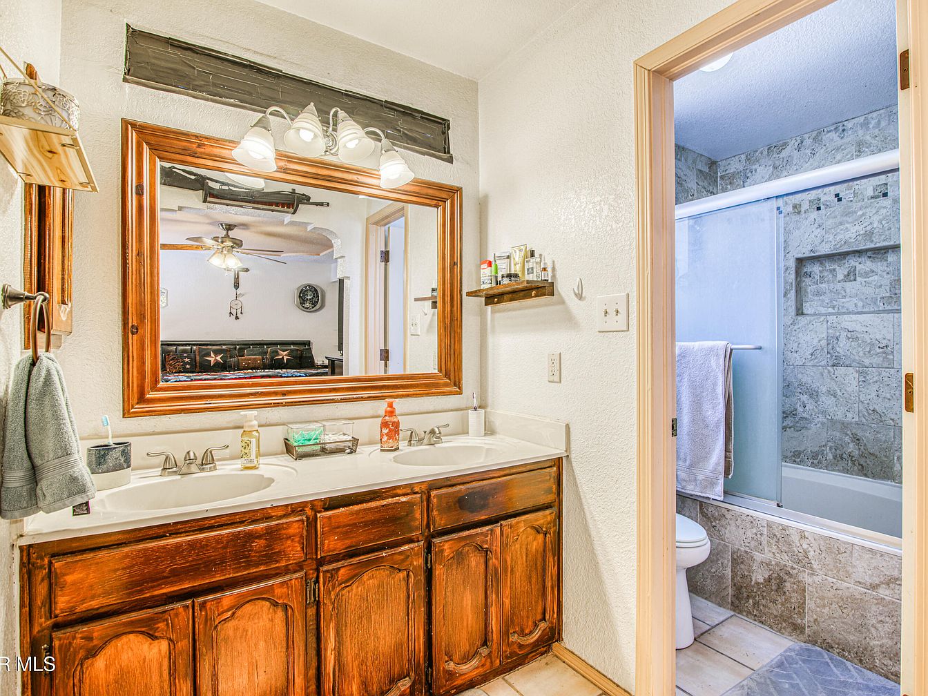 This bathroom features a warm, rustic vanity with rich, dark wood cabinetry beneath a white countertop that holds two sinks. A large framed mirror with matching wood trim stretches above the vanity, reflecting part of an adjacent room with a ceiling fan and decorative elements. Above the mirror, a light fixture with five frosted bulbs provides ample illumination. The walls are light-colored and textured, complementing the natural wood tones. To the right, a tiled shower and bathtub area with gray stone tiles and a glass sliding door add modern contrast. The tiled floor coordinates with the shower tiles, creating cohesive design flow.