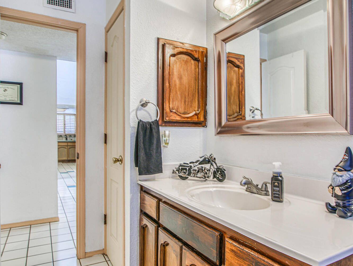 This bathroom vanity features a classic design with warm, natural wood cabinetry complemented by a sleek white countertop. The countertop houses a built-in sink with a simple, brushed nickel faucet. Above, a large framed mirror with a metallic finish reflects light, enhancing the space’s openness. A small, decorative metal motorcycle sculpture and a whimsical garden gnome add personal charm, while a black hand towel on a silver ring offers contrast. The walls are textured white, paired with light tan door and trim accents. The tile flooring continues out into the adjacent hallway, creating a cohesive flow between spaces.