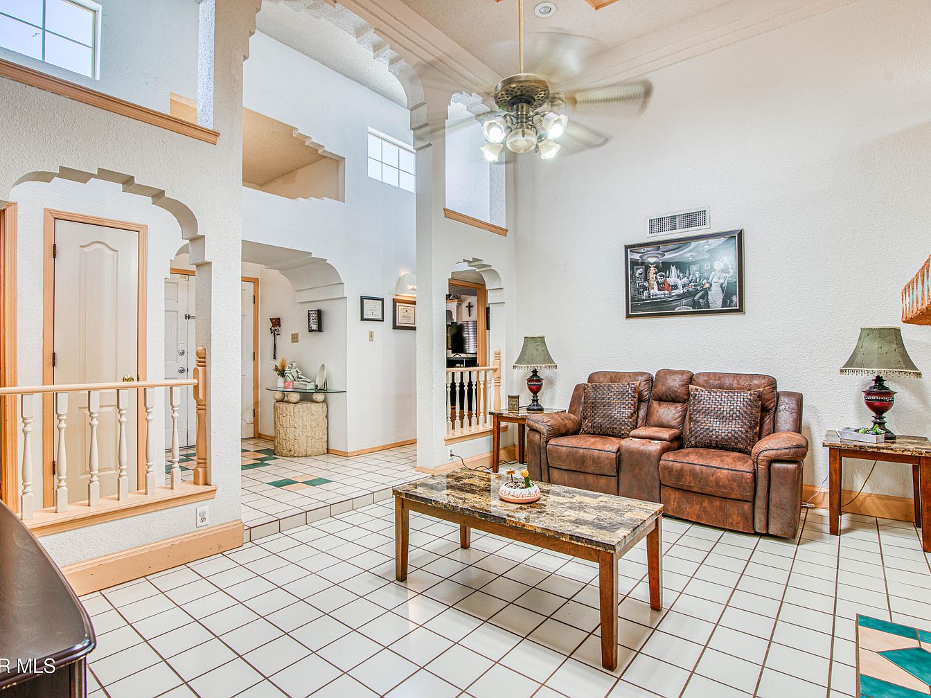 This cozy living room features a brown leather loveseat with plush cushions and two patterned throw pillows, positioned against a white textured wall. The flooring is tiled with large white squares and occasional colored accents, creating a bright and clean look. Two matching table lamps with decorative bases and fringe-trimmed shades flank the loveseat, adding warmth and traditional charm. Architectural details include intricately carved archways and high ceilings with an overhead ceiling fan that enhances air circulation. The space is inviting, with natural light filtering through high windows and a framed black-and-white artwork hanging above the seating area.
