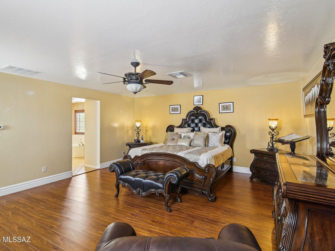 This spacious master bedroom features a warm beige color palette with smooth, light-textured walls and rich, medium-toned hardwood floors. The focal point is a grand dark wood bed with an ornate, tufted black leather headboard, complemented by an intricately carved bench in matching upholstery at its foot. Two dark wood nightstands, each holding elegant wrought iron lamps with frosted glass shades, flank the bed. A large matching dresser with a carved frame mirror adds sophistication. The ceiling contrasts subtly with its white finish and is enhanced by a dark bronze ceiling fan with wooden blades, balancing classic and comfort elements.