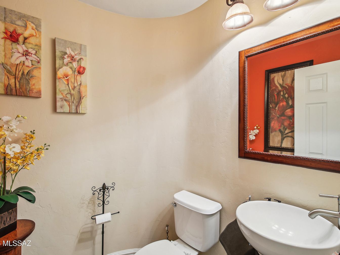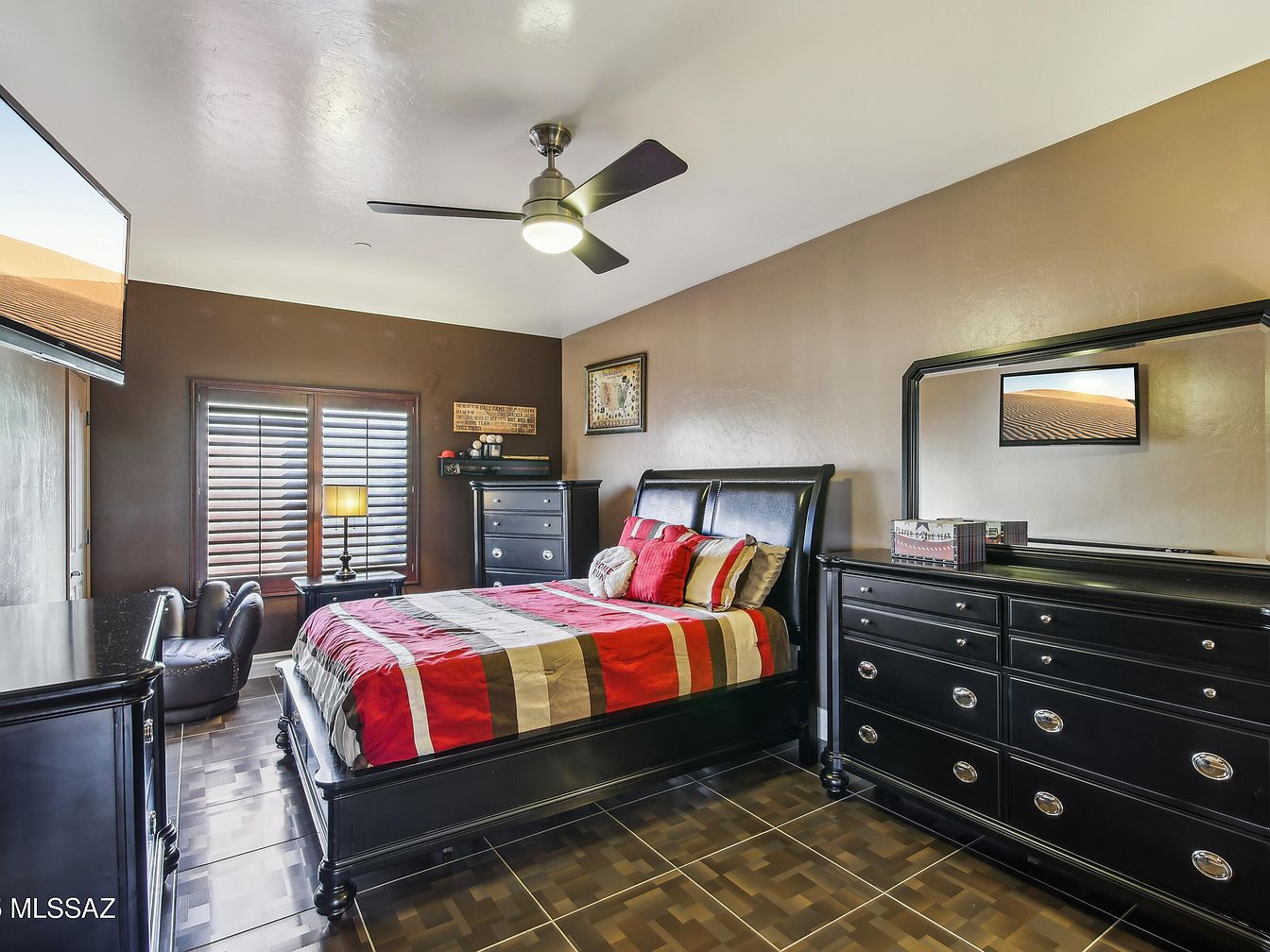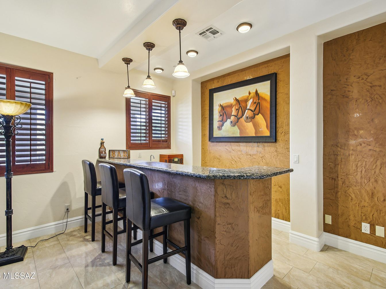 This beautiful residence, located in Tucson, Arizona, is a stunning example of Southwestern architectural style, characterized by its stucco exterior and red tile roof that complements the desert environment. Built originally as a solid and spacious home, this property has been updated with luxurious renovations that enhance comfort and entertaining possibilities. Priced at $999,000, this home offers a remarkable lifestyle amidst a private resort-like setting. The exterior features a meticulously designed backyard oasis complete with a breathtaking pool featuring a cascading waterfall, ambient evening lighting, and a unique swim-up pool bar. An in-ground outdoor kitchen adjacent to the pool bar maximizes convenience for hosting gatherings, while guests benefit from a dedicated outdoor restroom and shower. The landscaping incorporates low-maintenance turf and mature fruit trees, creating a lush yet practical private paradise. Inside, the home has been crafted to provide unparalleled comfort with three distinct master suites, each offering privacy and luxury suitable for family members or guests.