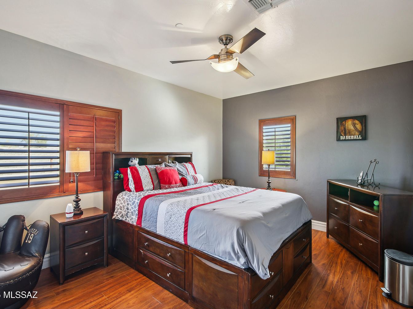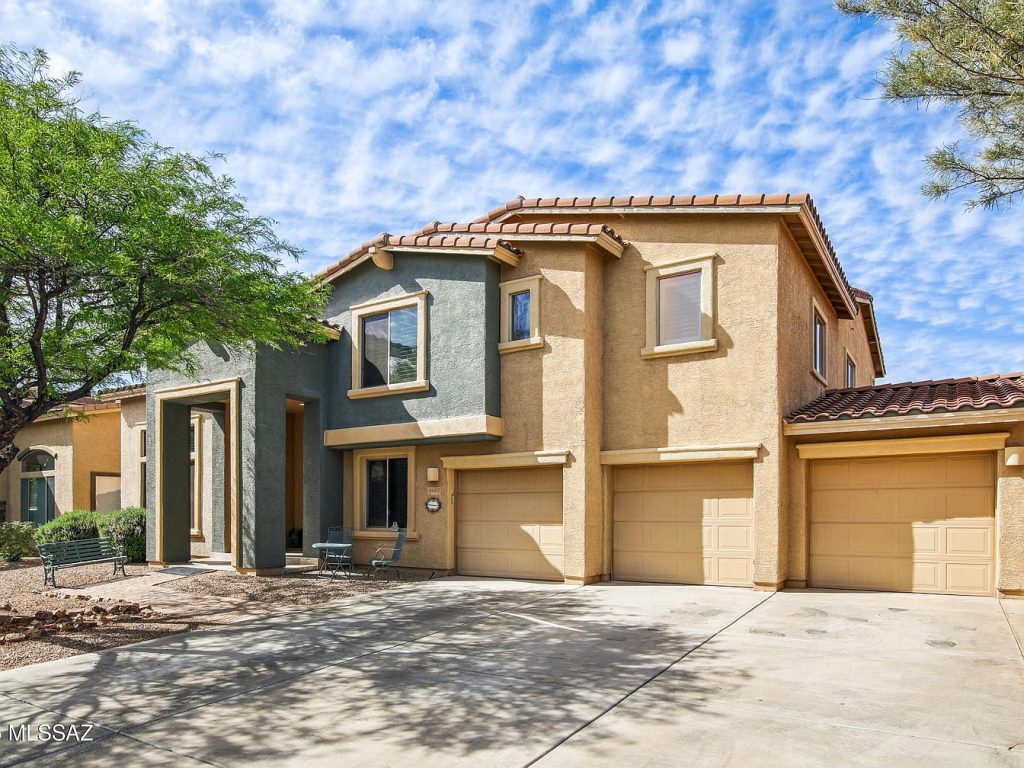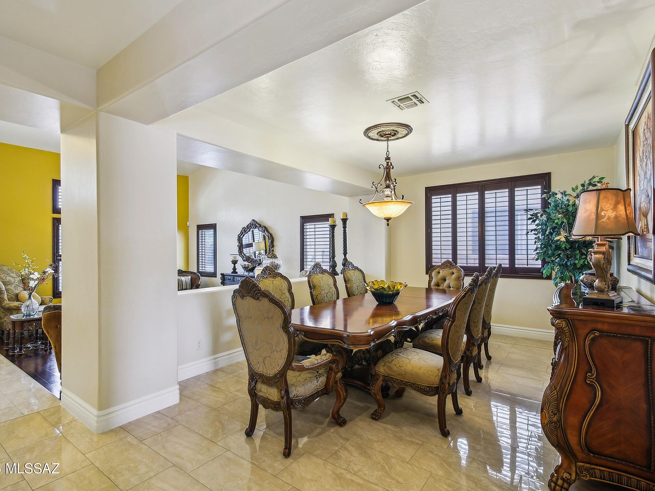 This beautiful residence, located in Tucson, Arizona, is a stunning example of Southwestern architectural style, characterized by its stucco exterior and red tile roof that complements the desert environment. Built originally as a solid and spacious home, this property has been updated with luxurious renovations that enhance comfort and entertaining possibilities. Priced at $999,000, this home offers a remarkable lifestyle amidst a private resort-like setting. The exterior features a meticulously designed backyard oasis complete with a breathtaking pool featuring a cascading waterfall, ambient evening lighting, and a unique swim-up pool bar. An in-ground outdoor kitchen adjacent to the pool bar maximizes convenience for hosting gatherings, while guests benefit from a dedicated outdoor restroom and shower. The landscaping incorporates low-maintenance turf and mature fruit trees, creating a lush yet practical private paradise. Inside, the home has been crafted to provide unparalleled comfort with three distinct master suites, each offering privacy and luxury suitable for family members or guests.