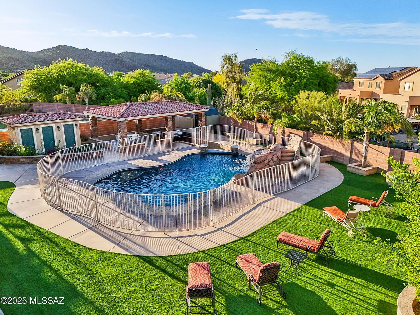 This inviting backyard features a kidney-shaped pool enclosed by a safety fence, complemented by a fun rock waterfall and slide element. Surrounding the pool, a concrete deck offers ample space for movement and sunbathing. Beyond the pool area, lush green artificial turf covers the yard, dotted with several cushioned lounge chairs in warm terracotta tones, paired with small side tables for relaxation. A covered patio with stone pillars and a terra-cotta roof provides shaded seating, while mature trees and desert mountain views create a serene, scenic backdrop, blending comfort with natural beauty.
