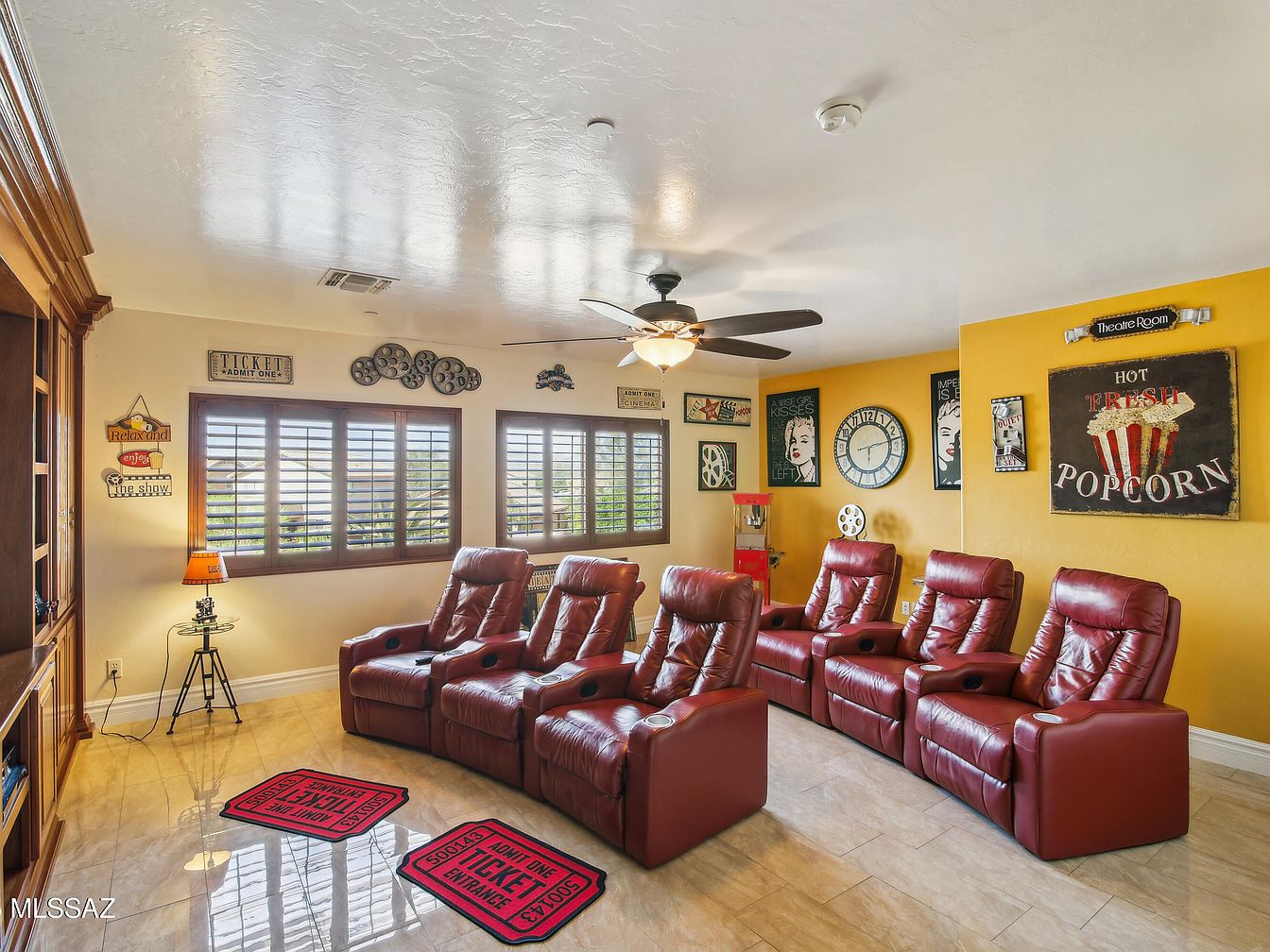 This dedicated home theater room features six plush burgundy leather recliners arranged in two rows, optimizing comfort and viewing experience. The warm yellow accent wall is decorated with vintage-inspired movie posters and a large clock, while walls opposite the seating showcase various cinema-themed decor, including film reels and ticket signs. Natural light filters through wooden shutter windows, complementing the polished tile flooring. A ceiling fan with a light fixture provides ventilation and ambient lighting. Thoughtful design balances practical viewing needs with whimsical, nostalgic movie memorabilia, creating an inviting and cozy entertainment space.