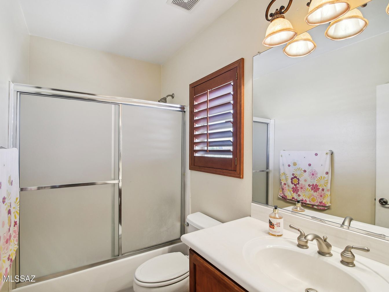 This bathroom features a compact layout with a white porcelain sink countertop resting on a warm, wooden vanity cabinet. A large mirror extends across the wall above the sink, reflecting light and enhancing the sense of space. The shower and tub combo is enclosed with sliding frosted glass doors framed in metal, maintaining a clean, contemporary look. A wooden window with plantation shutters adds texture and natural warmth, contrasting subtly against the cream-colored walls. Soft lighting from three overhead lamps creates a cozy, inviting ambiance. Functional and simple, this space offers a balance of softness and practicality.