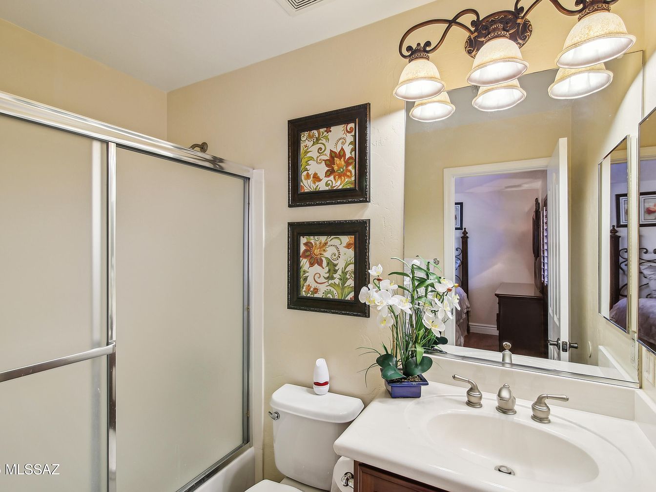 This bathroom features a compact layout with a white countertop vanity and a matching toilet. The vanity faucet and handles are finished in brushed nickel, complementing the light fixtures above the mirror, which have a warm, classic style with frosted glass shades. A large mirror spans the wall behind the sink, visually expanding the space and reflecting the adjacent bedroom. Neutral beige walls create a calm atmosphere, with two framed floral prints adding a touch of color and pattern. A frosted glass sliding shower door with chrome framing completes the practical, inviting design. A potted orchid adds a fresh, natural element to the sink area.