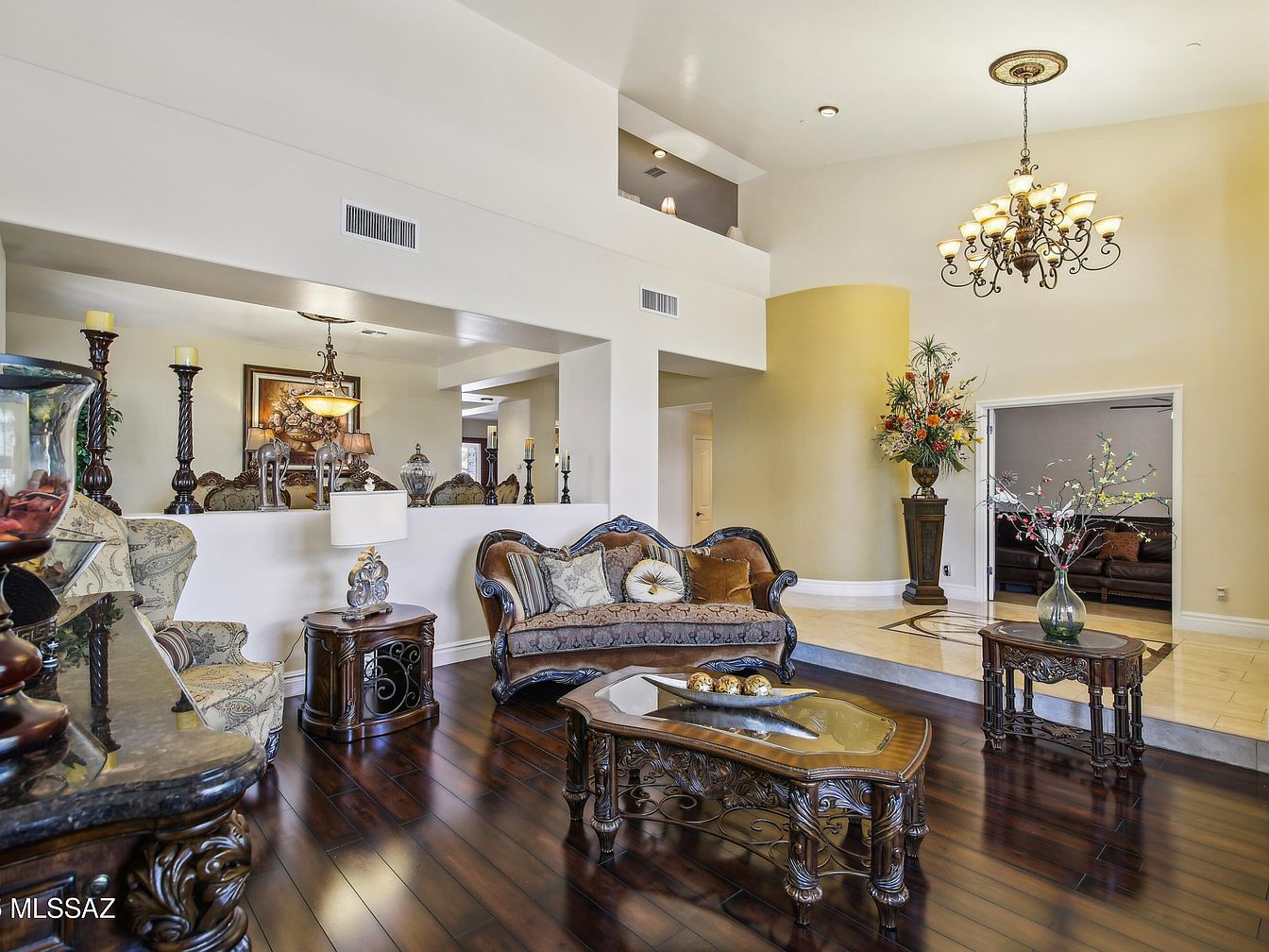This elegant living room features a rich, dark hardwood floor that contrasts beautifully with the soft cream walls and high ceilings. The space is anchored by intricately carved wooden furniture with plush upholstery in warm brown and beige tones, accented by multiple patterned and textured cushions. Ornate candle holders and decorative lamps add to the sophisticated ambiance. A multi-tiered chandelier with warm lighting hangs prominently, illuminating the area with a golden glow. The room opens into an adjacent space through a wide arched doorway, with a tall pedestal floral arrangement adding a touch of natural elegance and color.