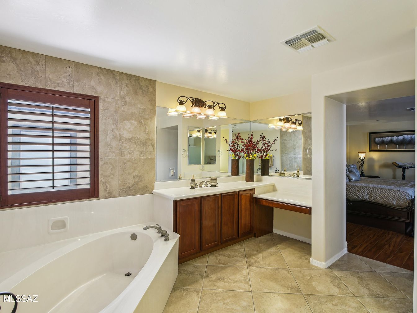 This master bathroom features a spacious and bright layout with a large corner vanity topped in a pristine white surface. Rich wooden cabinetry beneath adds warmth and contrast against the neutral tile floor and partial wall. A sizable bathtub with clean, flowing lines is positioned beneath a window framed in dark wood shutters, offering privacy and natural light. The wall above the vanity is entirely mirrored, enhancing the sense of space and light, and illuminated by an ornate multi-light fixture in bronze tones. Floral accents in a tall vase add a touch of natural elegance to the serene space. The bathroom opens into a cozy bedroom visible through an arched doorway, blending comfort and practicality.