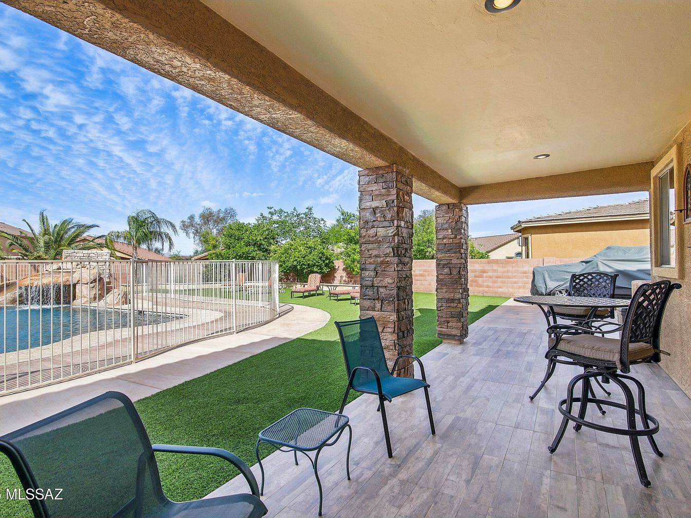 This covered patio features a light, neutral-toned wood-look tile floor that extends the outdoor living area with easy maintenance and a stylish finish. The roof is supported by two substantial stone-clad pillars that add rustic charm and texture to the space. A cozy seating arrangement includes dark metal framed chairs with mesh backs and light cushioned stools around a small round table, promoting casual relaxation or conversation. The patio overlooks a fenced pool area with a rock waterfall feature, surrounded by lush, green artificial turf and framed by clear blue skies, offering a serene backyard retreat.