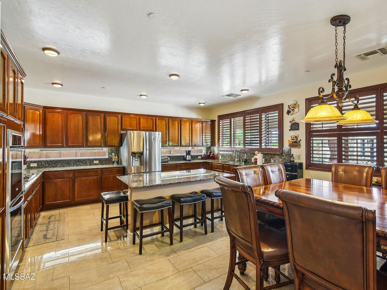 This spacious kitchen features warm wood cabinetry that stretches along two walls with a large island topped in polished granite at the center. The island doubles as a breakfast bar with four leather-upholstered stools. Adjacent to the kitchen is a formal dining space with a rich wood table surrounded by cushioned leather chairs, adding a touch of traditional elegance. The area is well-lit by both recessed ceiling lights and a wrought iron chandelier with amber glass shades, enhancing the cozy and inviting atmosphere. Large windows with wooden shutters provide natural light and privacy, while the floor is finished with beige glossy tiles that complement the overall earthy color palette.