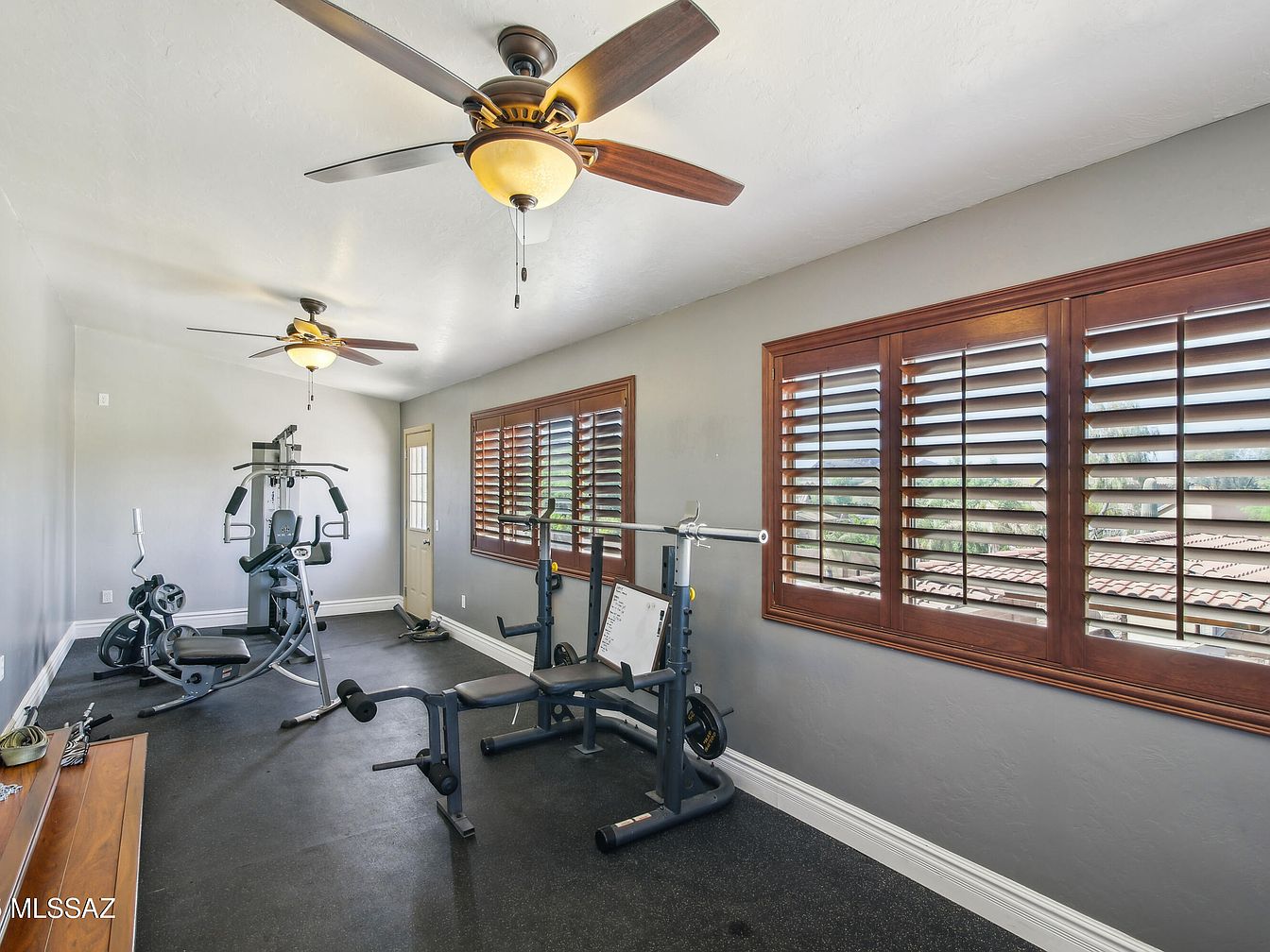 This bright home gym features a long rectangular layout with fitness equipment including a weight bench, multi-station gym machine, and stationary bike. The walls are painted a soft gray, creating a calm and neutral backdrop, while the dark rubber flooring provides durability and safety during workouts. Large wooden-framed windows with plantation shutters let in ample natural light and offer views of the exterior tiled roofs. Two ceiling fans with warm-toned light fixtures hang from the white ceiling, ensuring good air circulation. The room balances functionality and subtle style for an effective exercise space.
