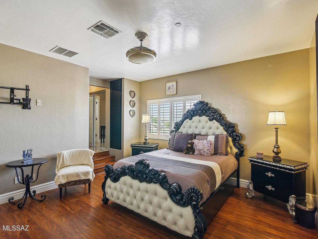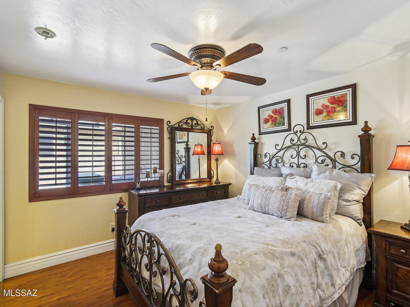 A warm and inviting master bedroom features a striking wrought-iron bed frame with intricate scrollwork, complemented by soft, neutral bedding with floral patterns. The room’s walls combine a pale yellow accent with crisp white, creating a cozy yet fresh atmosphere. Rich wooden furniture, including a dresser with an ornate mirror and dark stained nightstands, adds classic charm and functionality. Two amber-hued lamps on either side of the bed infuse the space with gentle, ambient lighting. Plantation shutters on the window allow for privacy and light control. A ceiling fan with wooden blades offers both comfort and style.