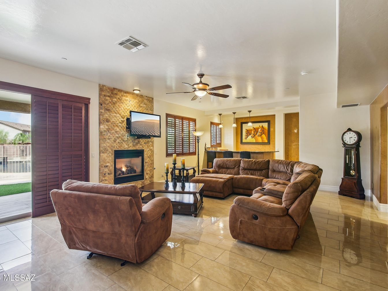 This spacious living room is designed for comfort and socializing, featuring a large L-shaped sectional sofa and a matching reclining armchair upholstered in soft brown suede-like fabric. The centerpiece coffee table is dark wood with storage drawers, complementing the neutral beige tile flooring that reflects light throughout the room. A stone-tiled fireplace anchors the space, with a mounted flat-screen TV above it. Wooden plantation shutters cover the windows and sliding door, adding warmth and privacy. Subtle recessed lighting and ceiling fan create an inviting ambiance, while a classic grandfather clock and vibrant horse painting offer distinctive decorative touches near the adjacent bar area.