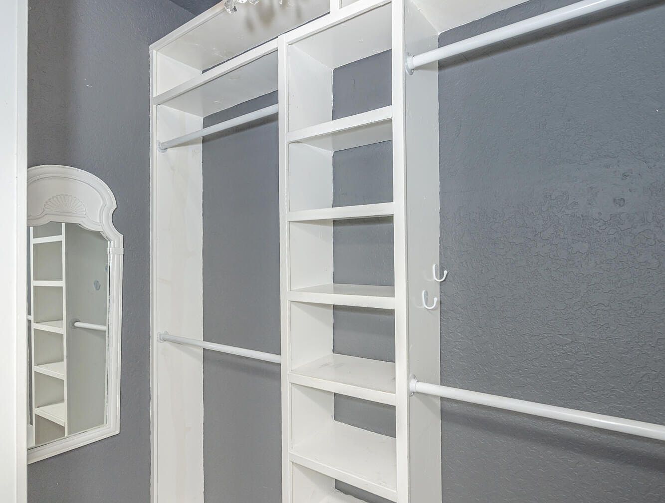 This walk-in closet features a practical layout with multiple white shelving units and hanging rods designed for optimal organization. The shelves offer ample space for folded clothes or accessories, while the rods accommodate hanging garments. The walls are painted in a muted gray tone, creating a modern and sleek contrast against the crisp white storage elements. An ornamental white-framed mirror on the left wall adds character and functionality, enhancing the space for dressing needs. The overall design embraces simplicity and utility, making this closet both stylish and efficient for daily use.