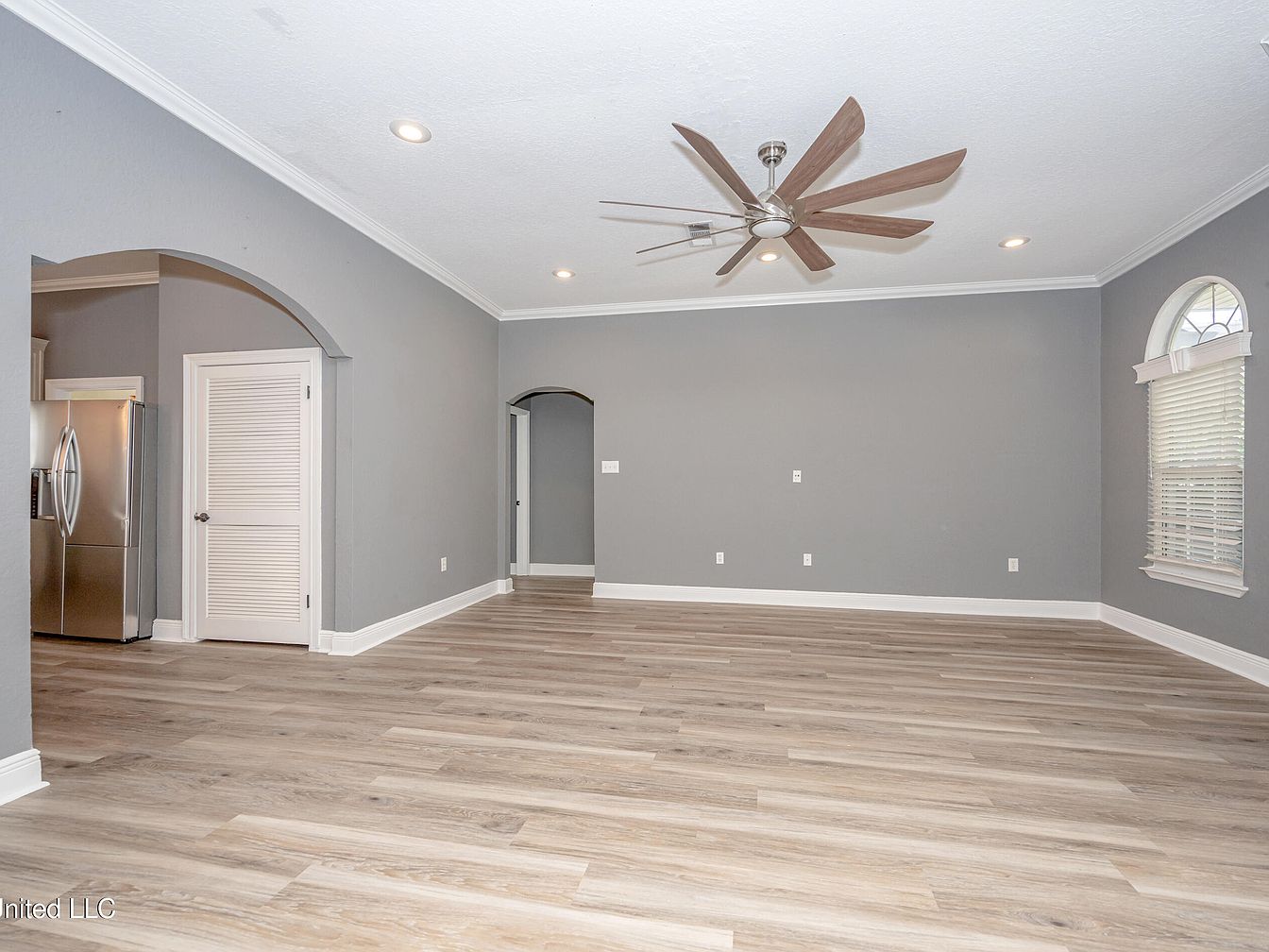 This spacious living room features a soft, neutral gray wall color that creates a calm and modern atmosphere. Light wood-look vinyl flooring adds warmth and texture, complementing the cool tones on the walls. White baseboards and crown molding provide elegant, crisp accents around the perimeter. A large ceiling fan with multiple wooden blades serves as a striking focal point while ensuring ample air circulation. Recessed lighting offers even brightness throughout the space. Architectural details include an arched entryway leading to other rooms and a charming arched window with white blinds, allowing natural light to filter in gently.