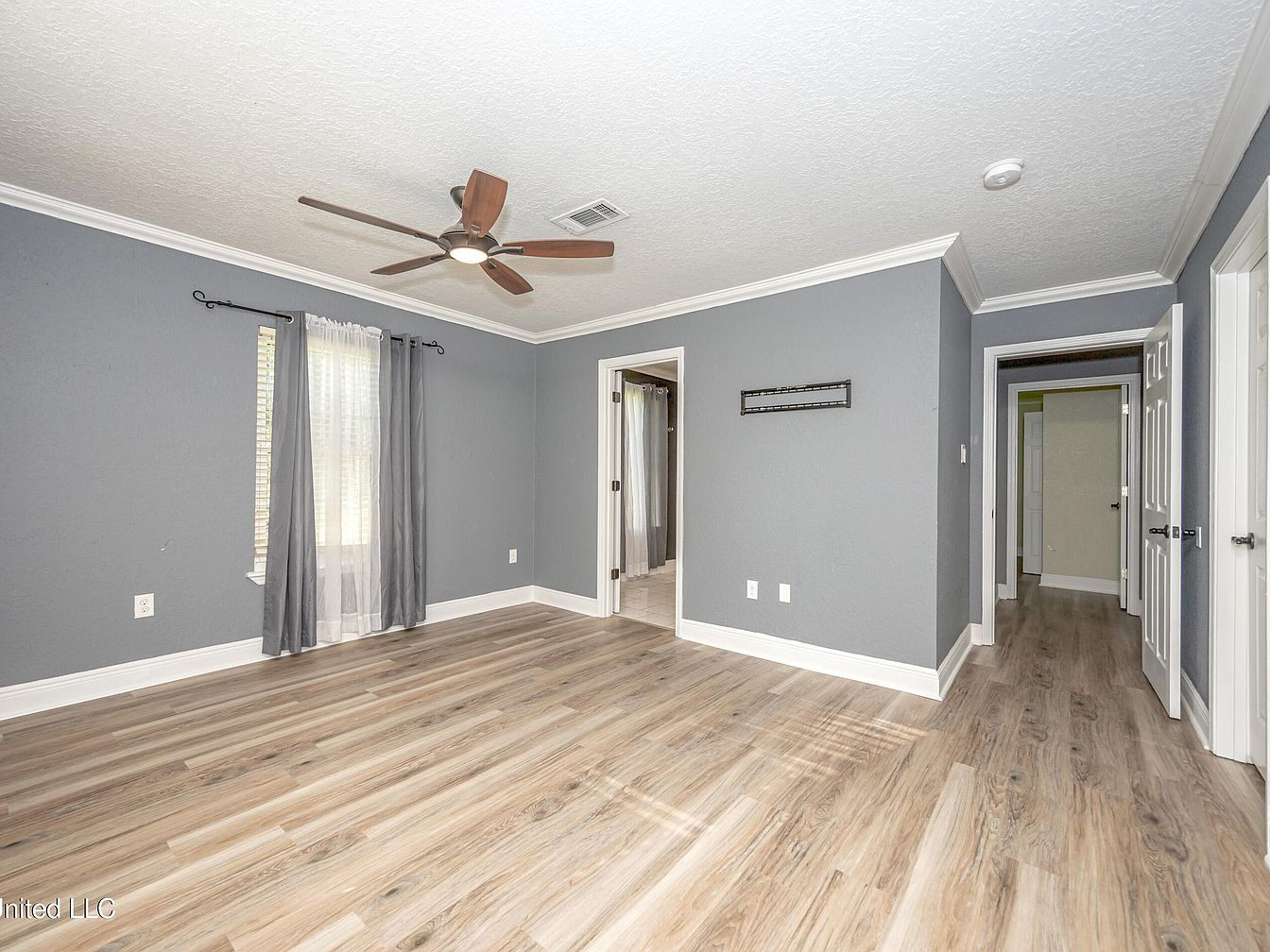 This bedroom features a calming gray and white color palette, with soft gray walls paired with crisp white crown molding and baseboards. The light wood-look flooring adds warmth and texture, complementing the modern yet cozy aesthetic. A large window with layered curtains brings in natural light while maintaining privacy. The ceiling fan with wood-toned blades and integrated light adds both function and style. Multiple doorways lead to adjoining rooms or closets, enhancing the room’s spacious feel and flow. The overall design balances simplicity and comfort, perfect for restful living.