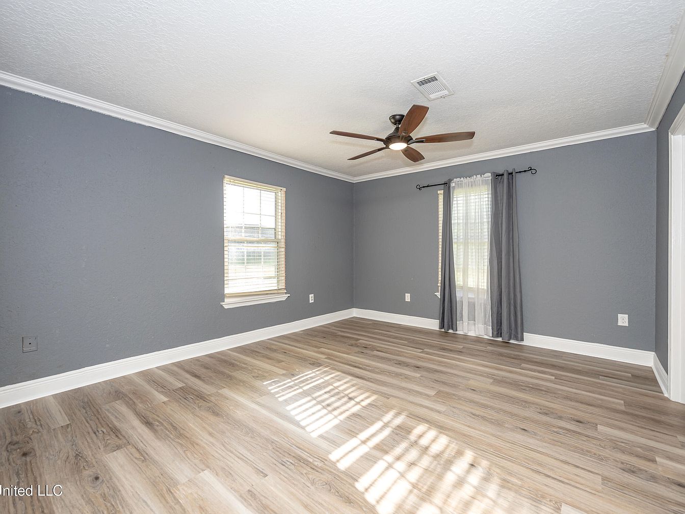 This spacious bedroom features cool gray walls complemented by white crown molding and baseboards, creating a clean and modern contrast. Light wood laminate flooring adds warmth and texture while reflecting natural light. Two windows, one fitted with blinds and the other with sheer white curtains flanked by gray drapes, invite ample daylight, highlighting the room’s airy feel. A ceiling fan with wooden blades provides both functional airflow and a subtle natural accent. The minimalistic design and neutral palette offer a versatile canvas for personalized bedroom styling.