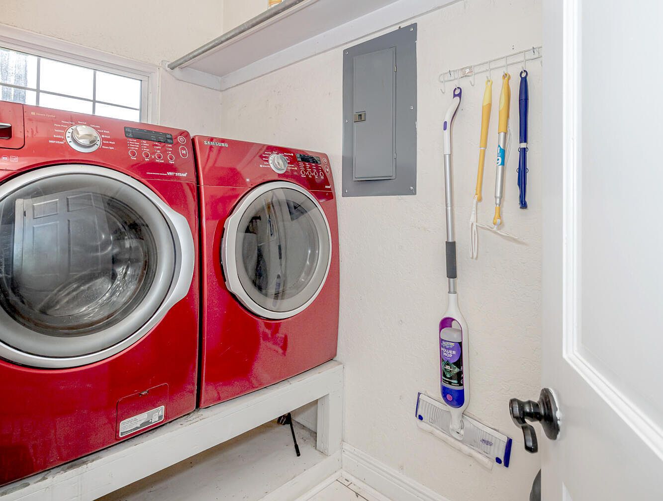 This laundry room features a compact, efficient layout with a front-loading washer and dryer both in a striking red finish, positioned side-by-side on a raised white platform. The white walls and trim provide a neutral backdrop, making the bold appliances stand out as focal points. A small window above allows natural light to brighten the space. On the adjacent wall, cleaning tools like mops and dusters are hung neatly on hooks, adding to the organized feel. The simple architectural details include clean lines and a white door with a classic black handle, emphasizing function with subtle style.