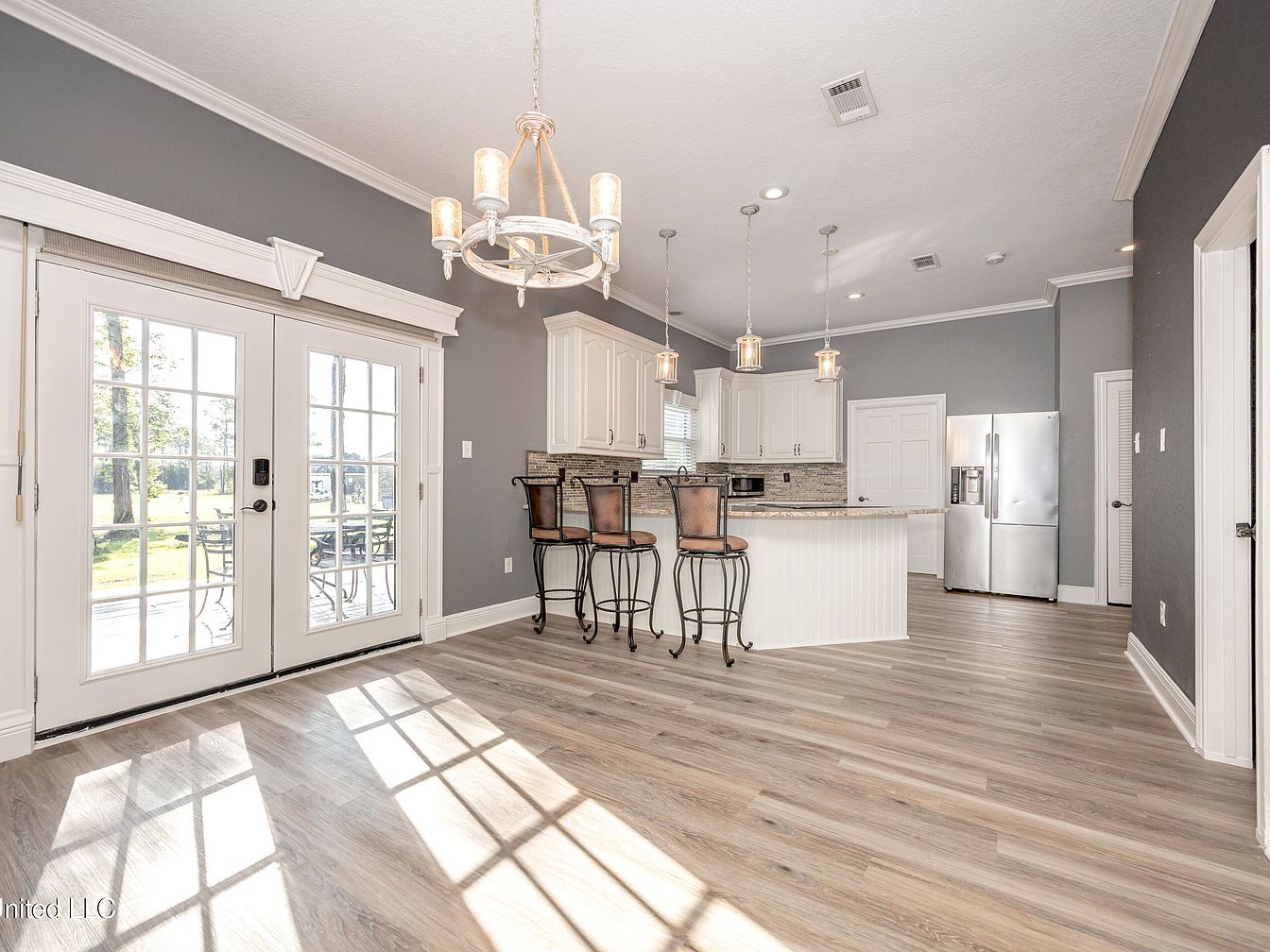 This spacious kitchen and dining area features a modern open-concept layout highlighted by soft gray walls complemented with crisp white trim and cabinetry. The kitchen island, with a beadboard design base and granite countertop, serves as a breakfast bar with three wrought-iron stools adding an elegant touch. Pendant lights hang above the island while a rustic chandelier adds charm over the dining space. The flooring is a light wood laminate that enhances the airy, sunlit feel from the French doors, which lead to an outdoor patio. Stainless steel appliances and a mosaic tile backsplash complete this inviting, functional space.