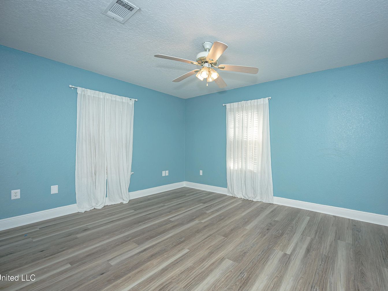 This cozy bedroom features walls painted in a calming soft blue, enhancing a serene and relaxing atmosphere. The flooring consists of a light grayish wood laminate, adding warmth and texture to the space. Two windows draped with sheer white curtains allow natural light to filter gently into the room, balancing privacy and brightness. A ceiling fan with integrated lights hangs centrally, offering both air circulation and illumination. White baseboards provide a crisp contrast to the blue walls and complement the trim around the windows. The room’s minimalistic and clean design offers a tranquil retreat.