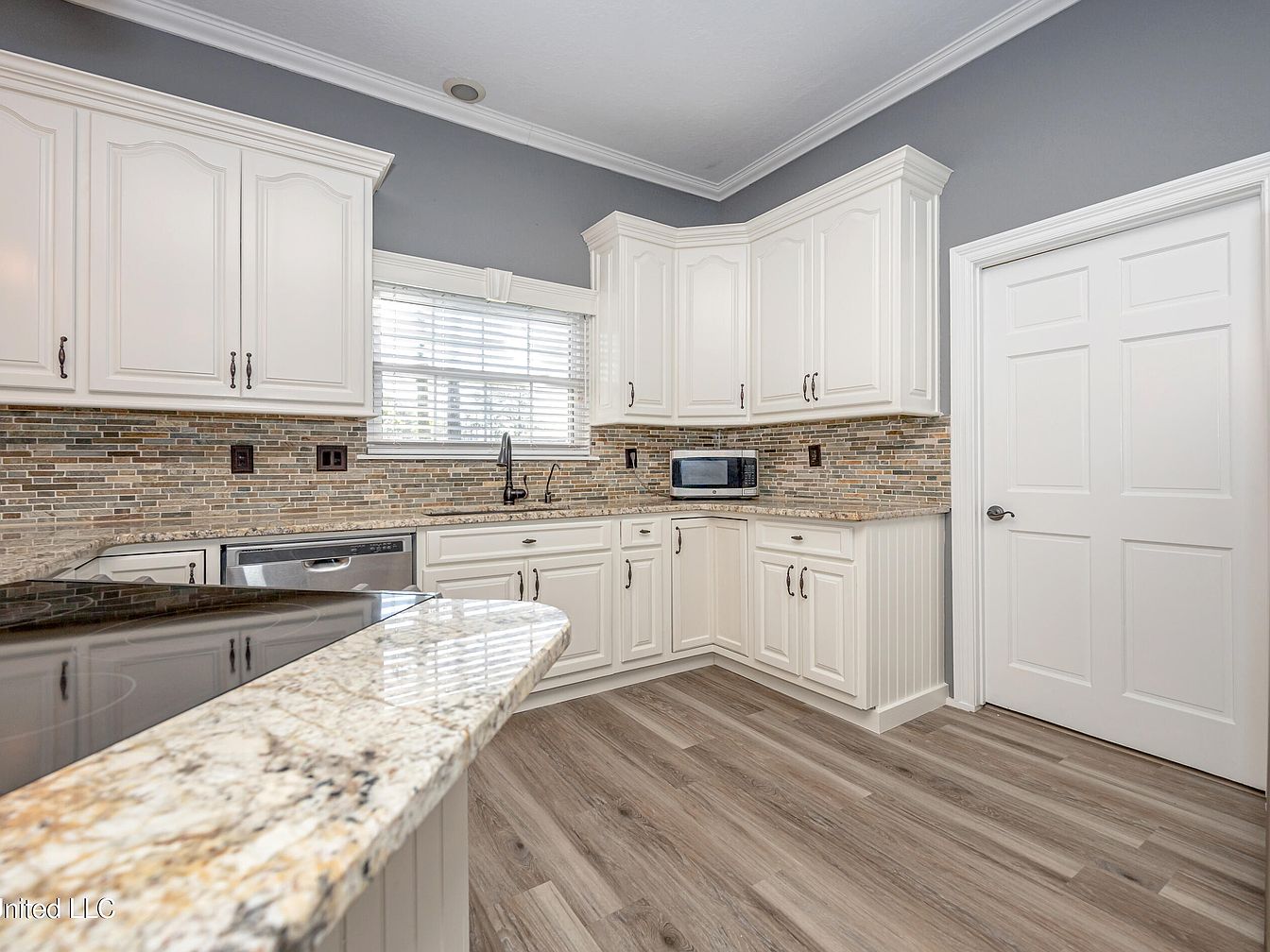 This kitchen corner highlights a sophisticated blend of classic and contemporary design. The white cabinetry with detailed molding and bronze handles offers a timeless charm, paired elegantly with a multicolored mosaic tile backsplash in earthy tones. Granite countertops with subtle veining provide a durable and stylish workspace, extending into a curved breakfast bar. The stainless steel dishwasher blends seamlessly below the counter, just under a window adorned with white blinds, inviting natural light to brighten the space. The room is framed by gray walls and light wood-look flooring, creating a harmonious and airy ambiance. A microwave sits neatly in the corner, while the white paneled door adds to the kitchen’s clean and polished look.