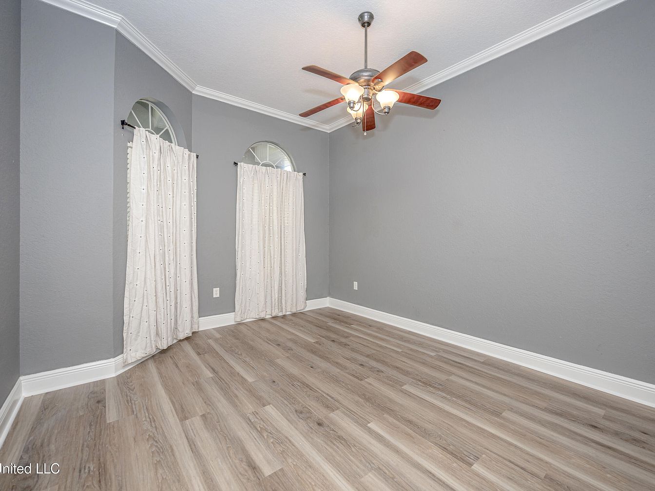 This cozy bedroom corner features two distinct arched windows dressed with soft, cream-colored curtains that gently diffuse natural light. The walls are painted a calm gray tone, complemented by crisp white crown molding and baseboards that add architectural refinement. The flooring consists of light-toned wood planks, enhancing the room’s airy and modern aesthetic. A classic ceiling fan with warm wood blades and soft overhead lighting hangs centrally, providing both function and a traditional touch. The space is clean and neutral, inviting personalization and relaxation in a serene, well-designed retreat.