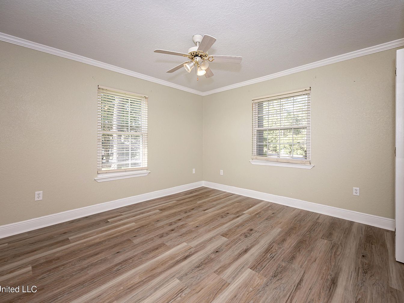 This bedroom features a clean and neutral color palette with beige walls and crisp white crown molding and baseboards that frame the room elegantly. The flooring consists of wood-look planks with varying shades of light and medium brown, adding warmth and texture. Natural light filters in through two windows dressed with white horizontal blinds, brightening the space while providing privacy. A white ceiling fan with light fixtures hangs centrally, offering both air circulation and ambient light. The simple layout and uncluttered design allow for versatile furnishing and personalization options.