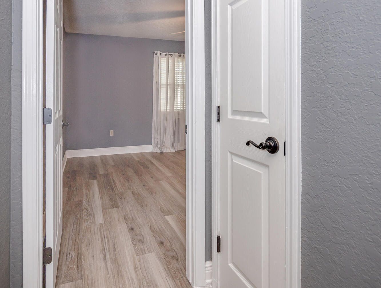 Stepping through the white paneled door with classic dark bronze hardware, the entrance leads into a cozy bedroom space. The walls are painted in a calming muted grayish-blue tone that contrasts softly with the crisp white baseboards and doorframe. Light-toned wood flooring with natural grain patterns flows throughout, adding warmth and texture. A window adorned with sheer white curtains combined with plantation shutters allows natural light to gently filter into the room. The textured walls and neutral, harmonious colors contribute to an inviting and serene atmosphere perfect for relaxation.
