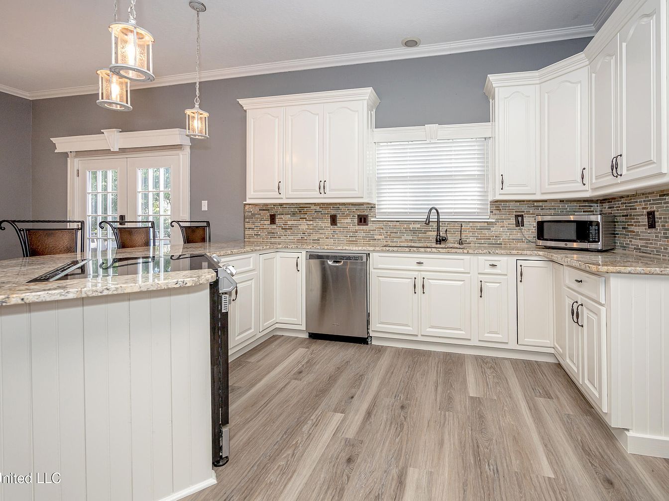 This kitchen features a spacious U-shaped layout with white paneled cabinetry that contrasts beautifully with the muted gray walls. A granite countertop extends into a breakfast bar with seating for three, accented by elegant metal barstools. The backsplash is composed of small, rectangular tiles in earth tones that complement the neutral color palette. Stainless steel appliances, including a dishwasher and microwave, add a modern touch. Overhead, three glass pendant lights provide soft illumination, while a large window above the sink allows natural light to fill the space. The flooring is a wood-look laminate in a light gray tone, enhancing the room’s clean, contemporary aesthetic.