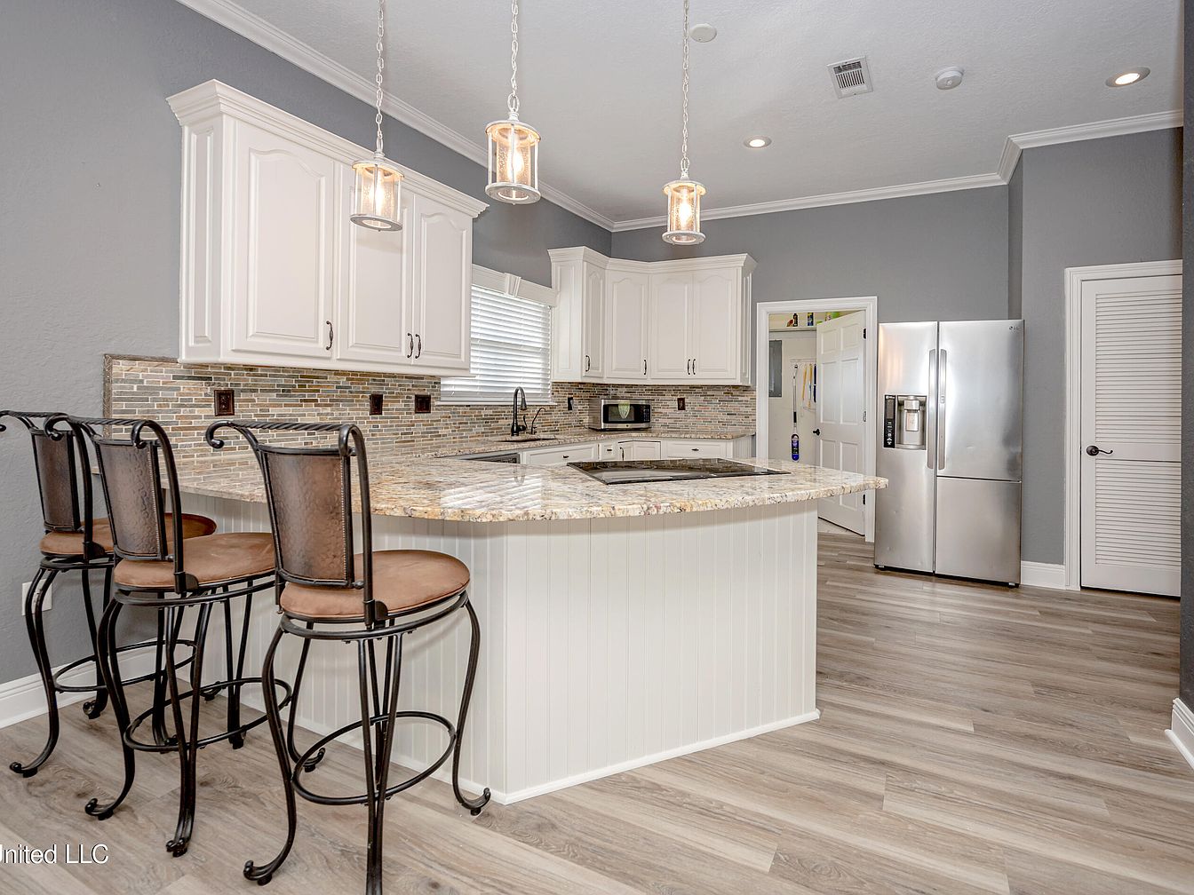 This kitchen features a spacious island with a granite countertop that extends to accommodate three wrought iron bar stools with cushioned seats, creating a casual dining or gathering spot. The cabinetry is classic white with detailed molding, complementing the cool gray walls and mosaic tile backsplash in neutral earth tones. Stainless steel appliances, including a large refrigerator, enhance the modern appeal alongside the sleek black faucet and cooktop. The hardwood-style flooring in light gray blends seamlessly with the room’s color palette, while pendant lights hanging over the island provide warm, ambient illumination.