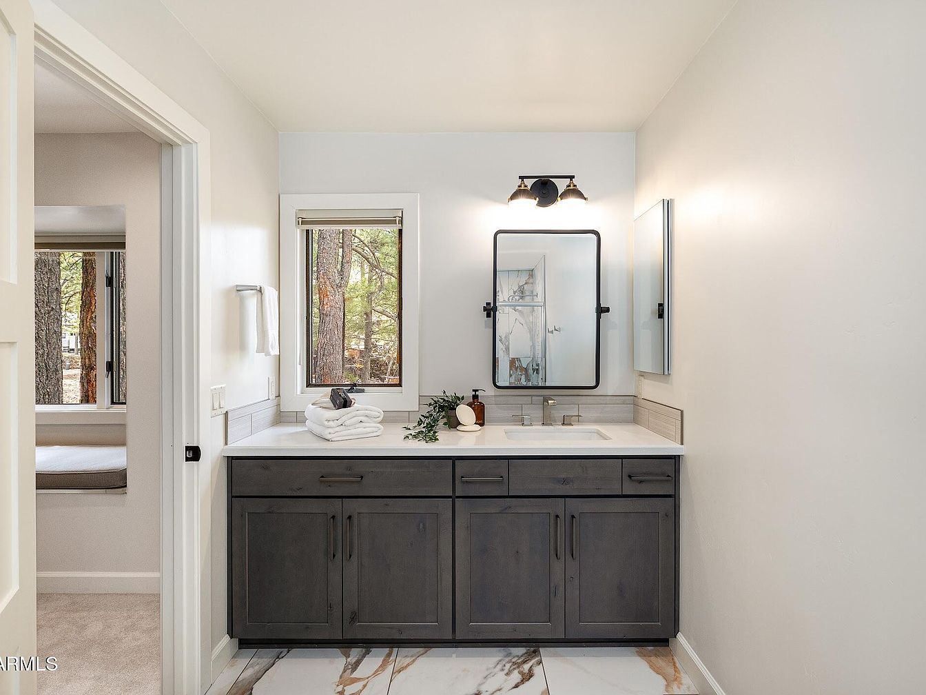 This bathroom features a sleek vanity with dark gray cabinetry that contrasts beautifully against the light walls and white countertop. The single sink is integrated seamlessly with a modern rectangular basin, complemented by a minimalist chrome faucet. Above, a rectangular black-framed mirror adds a touch of industrial style, illuminated by a dual-light fixture in a coordinating dark finish. Light gray backsplash tiles extend just below the mirror and along the sides, enhancing the clean, contemporary aesthetic. Natural light filters in through a window framed in white, while the marble-patterned floor tiles bring subtle luxury and warmth with their gray and beige veining. Simple decorative touches include neatly folded white towels and a small green plant, contributing to the fresh and inviting atmosphere.