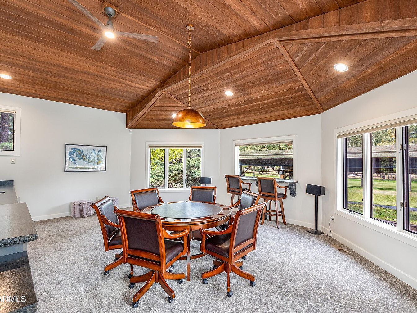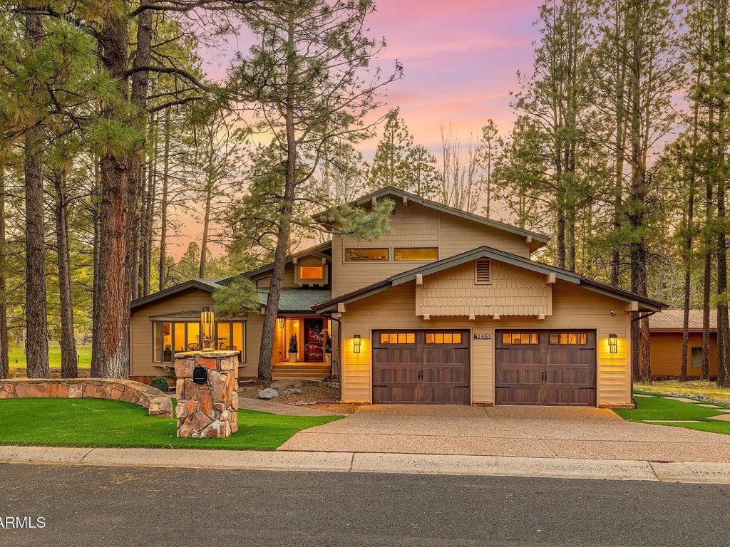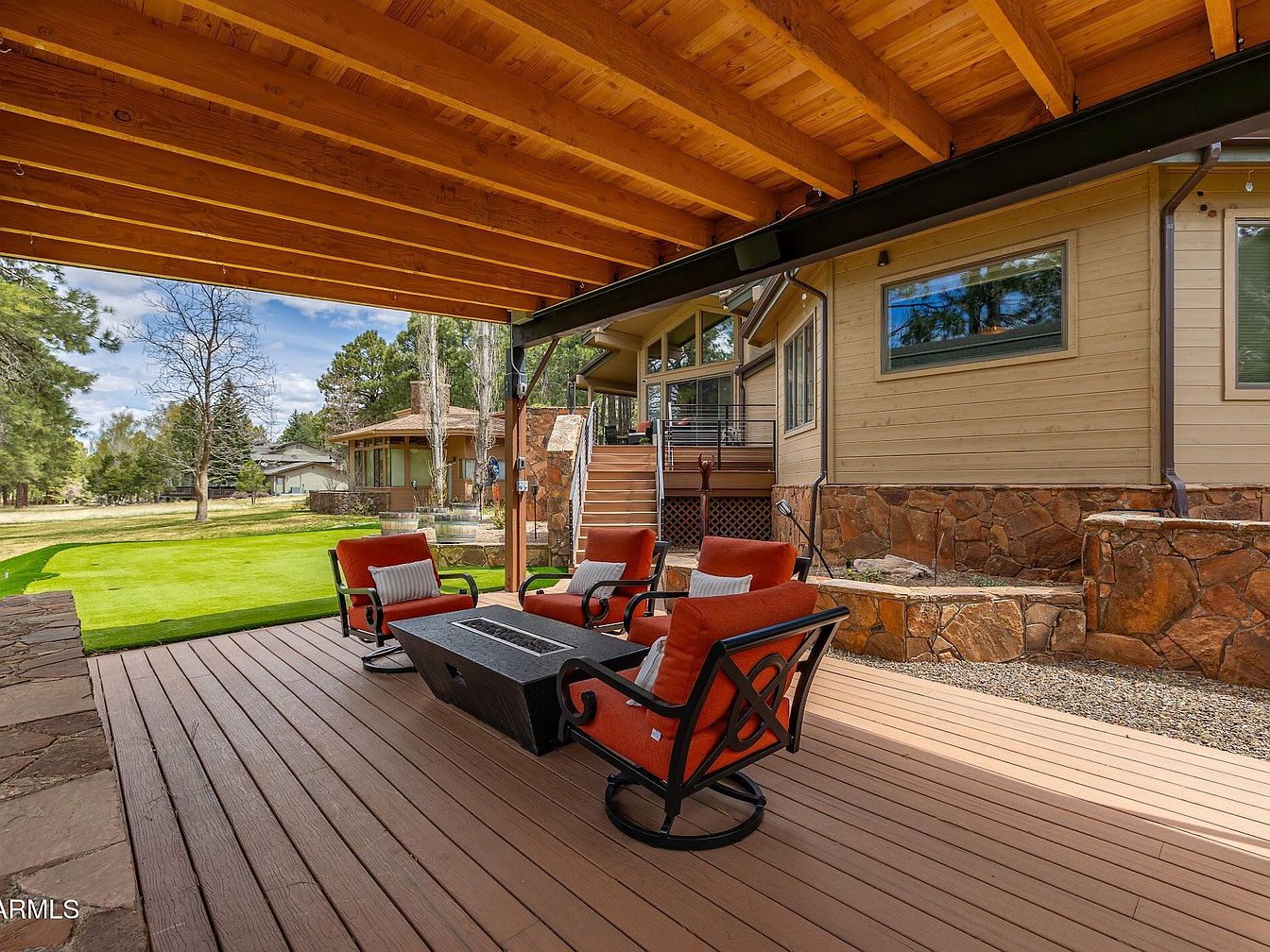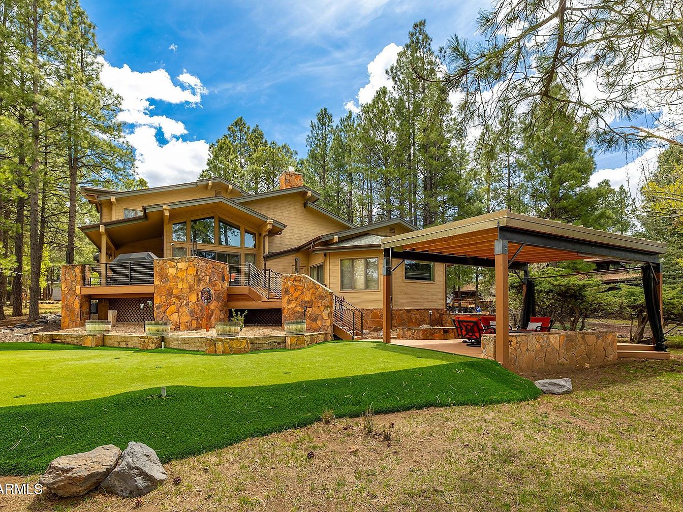 This stunning home in Flagstaff, AZ, exemplifies a blend of mountain lodge architectural style with modern luxury. Nestled among towering Ponderosa pines and located directly on a golf course, this residence offers an exceptional natural setting that includes the unique experience of a local elk herd roaming nearby. The house has been recently remodeled, elevating both its aesthetic appeal and functional design. While the exact year of original construction is not specified, the property showcases contemporary upgrades and features that reflect meticulous renovation efforts. Offered at $2,600,000, this luxury property stands in one of Flagstaff’s most desirable non-gated communities, emphasizing privacy and a connection to the tranquil outdoors. The spacious plot features expansive new decks with a large pergola beneath, perfect for entertaining or relaxing while enjoying the natural surroundings. The home incorporates upscale interior amenities including a chef’s kitchen equipped with extensive counter space, a built-in butler’s pantry, and buffet area, as well as a separate laundry room. The interior boasts soaring cathedral ceilings that bathe the living space in natural light, complementing the warm tones visible through the large windows. The primary suite serves as a personal retreat with oversized closets, dual water closets, a spa-style soaking tub, and a walk-in shower. A cozy gas fireplace and built-in surround sound speakers contribute to the ambiance. Below, the versatile den or game room is equipped with a built-in wet bar, sink, and beverage fridge, ideal for hosting game days or movie nights. Additional highlights include private putting green access and scenic views overlooking the golf course and native forest, making this home a true sanctuary combining luxury, comfort, and nature.