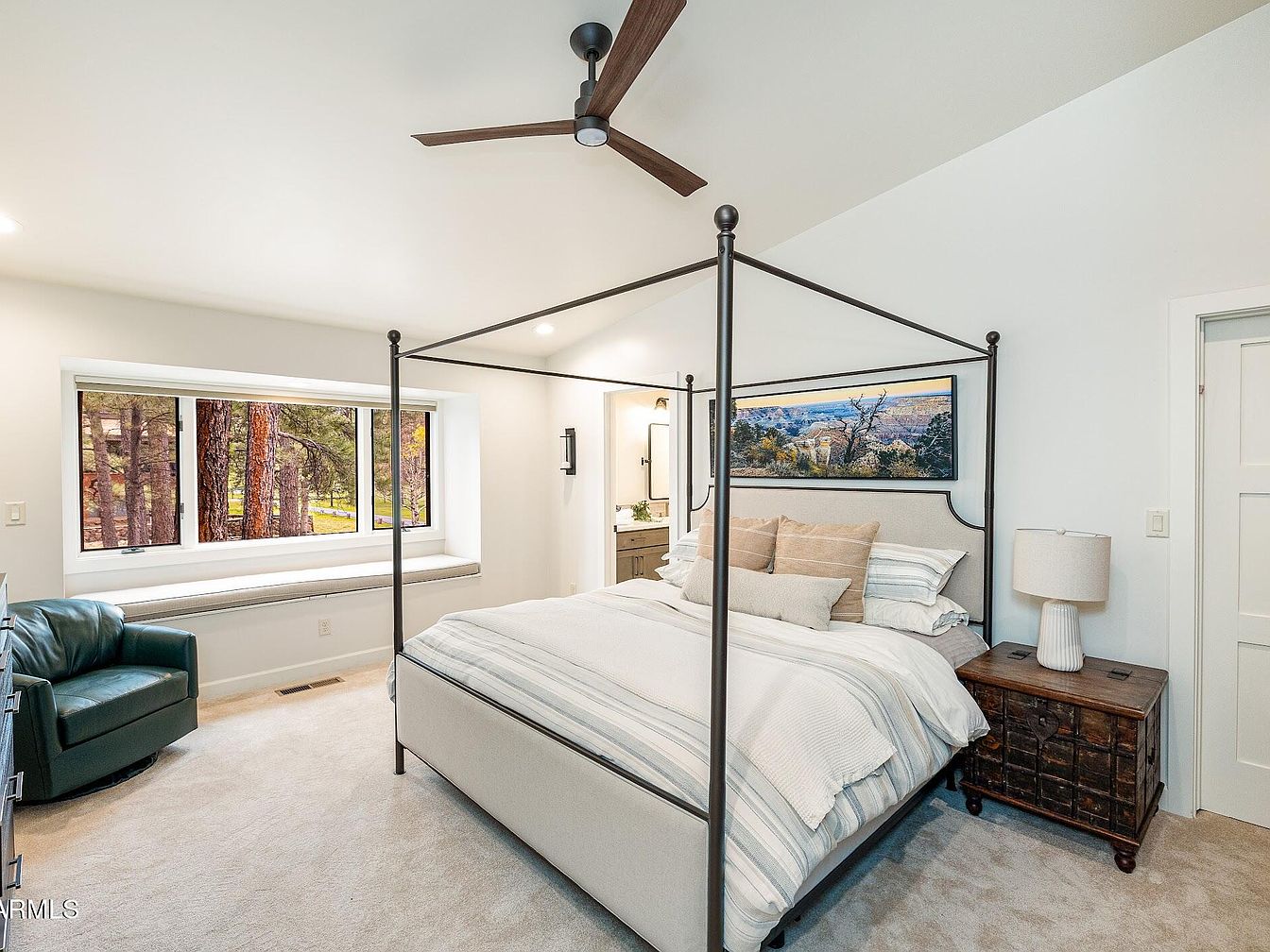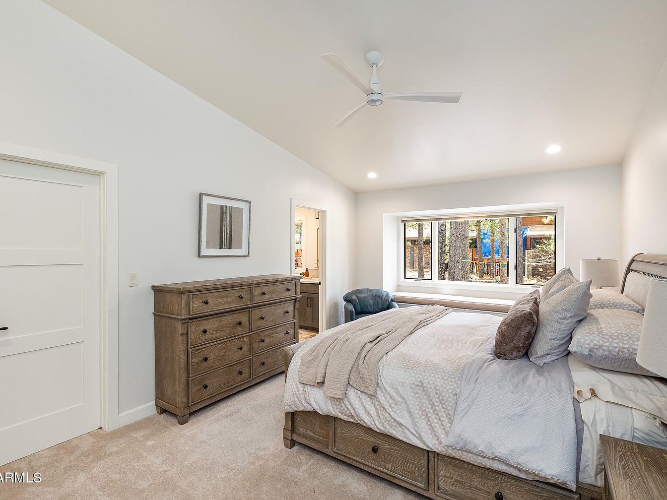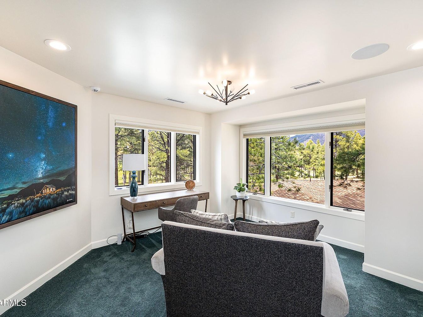 This stunning home in Flagstaff, AZ, exemplifies a blend of mountain lodge architectural style with modern luxury. Nestled among towering Ponderosa pines and located directly on a golf course, this residence offers an exceptional natural setting that includes the unique experience of a local elk herd roaming nearby. The house has been recently remodeled, elevating both its aesthetic appeal and functional design. While the exact year of original construction is not specified, the property showcases contemporary upgrades and features that reflect meticulous renovation efforts. Offered at $2,600,000, this luxury property stands in one of Flagstaff’s most desirable non-gated communities, emphasizing privacy and a connection to the tranquil outdoors. The spacious plot features expansive new decks with a large pergola beneath, perfect for entertaining or relaxing while enjoying the natural surroundings. The home incorporates upscale interior amenities including a chef’s kitchen equipped with extensive counter space, a built-in butler’s pantry, and buffet area, as well as a separate laundry room. The interior boasts soaring cathedral ceilings that bathe the living space in natural light, complementing the warm tones visible through the large windows. The primary suite serves as a personal retreat with oversized closets, dual water closets, a spa-style soaking tub, and a walk-in shower. A cozy gas fireplace and built-in surround sound speakers contribute to the ambiance. Below, the versatile den or game room is equipped with a built-in wet bar, sink, and beverage fridge, ideal for hosting game days or movie nights. Additional highlights include private putting green access and scenic views overlooking the golf course and native forest, making this home a true sanctuary combining luxury, comfort, and nature.