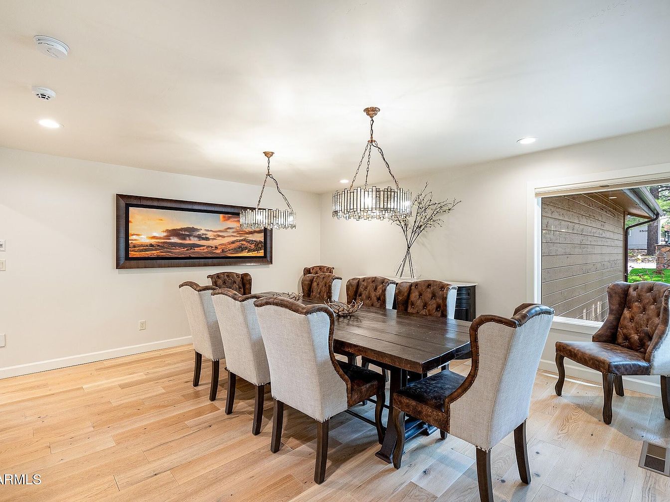 This elegant dining room features a large, dark wood table surrounded by eight upholstered chairs with tufted backs in a rich brown and light beige fabric combo, combining comfort with rustic charm. The spacious layout offers easy movement around the table, accentuated by light wood floors that add warmth and natural texture. Two modern cylindrical chandeliers with crystal-like detailing provide a sophisticated light source, enhancing the room’s inviting ambiance. A wide window floods the space with natural light and offers views of the outdoors, while a large landscape artwork and a decorative vase with branches add tasteful focal points.